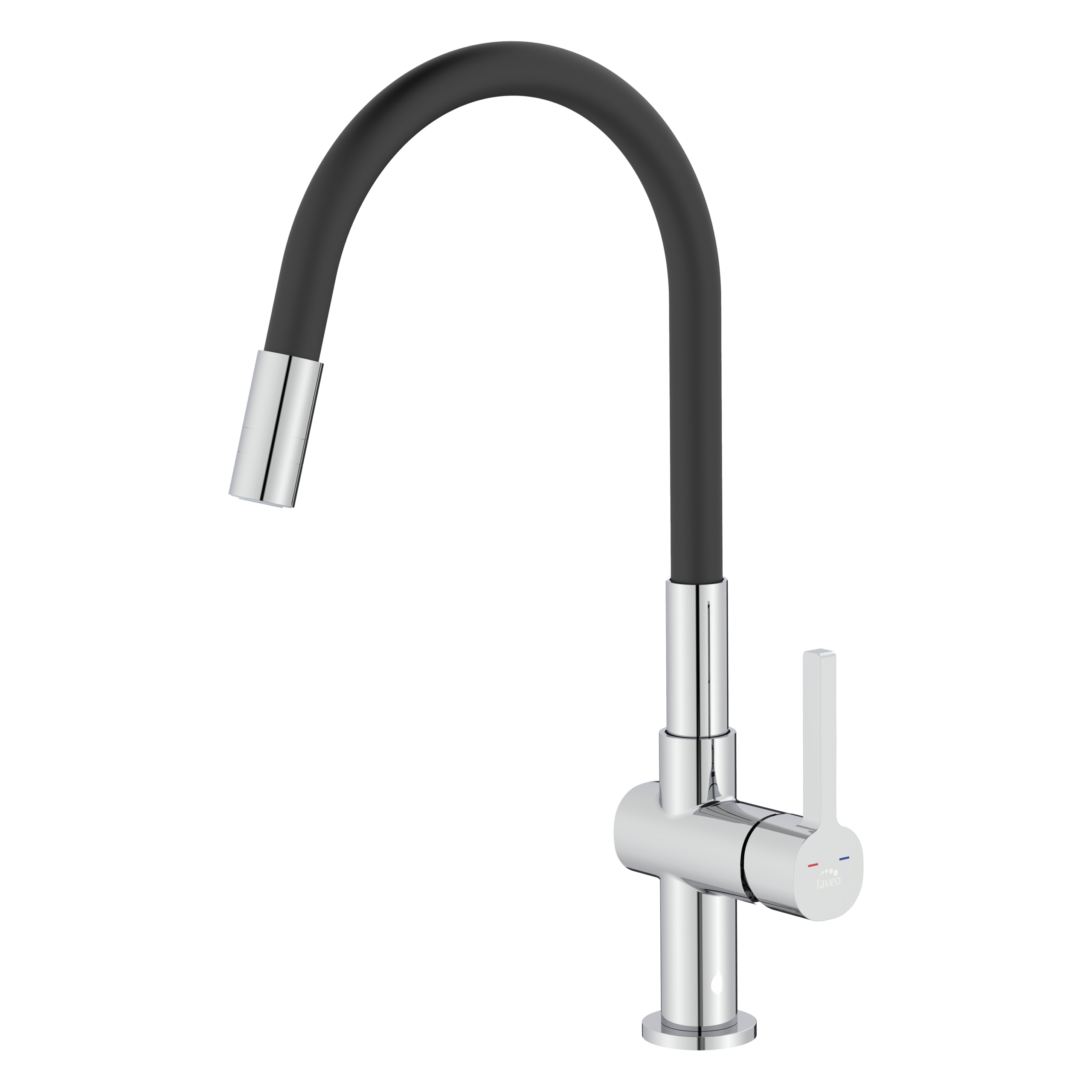 Baterie kuchenne Alita oferują dwa rodzaje strumienia – ciągły i deszczowy – co daje większą kontrolę nad zużyciem wody i dostosowaniem jej do konkretnego zadania. Wersje z ruchomą wylewką w kształcie litery U zapewniają większą swobodę ruchu przy zlewie, a warianty z elastyczną wylewką pozwalają precyzyjnie skierować strumień tam, gdzie jest potrzebny. Modele elastyczne dostępne są w trzech wykończeniach: chrom/ czarne, czarne, nikiel szczotkowany/czarne, co ułatwia dopasowanie ich do różnych aranżacji kuchennych.
