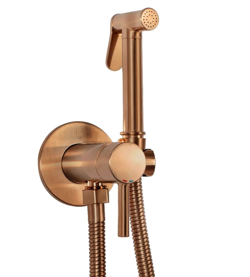 Niezwykle funkcjonalna i nowoczesna bateria bidetowa, przystosowana do montażu podtynkowego przy bidecie. Została wykonana z wysokiej jakości mosiądzu pokrytego potrójną miedzianą warstwą, a następnie powierzchnia była szczotkowana. Dzięki specjalnej fazie produkcji jest trwała i łatwa w utrzymaniu czystości.