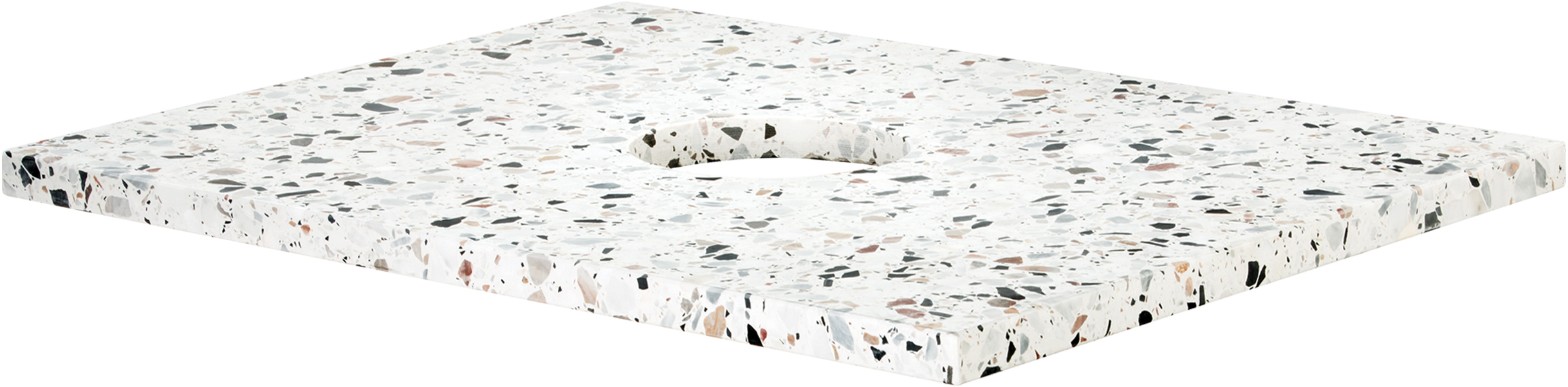 Kamienny blat pod umywalkę pasujący rozmiarem do wybranych konsoli łazienkowych Deante (CST X60A, CSW X60A, CSD X60A) to produkt, który spodoba się wszystkim miłośnikom nowoczesnych rozwiązań. Blaty z linii Terazzo wykonane zostały z lastryko – kompozytowego kamienia powstałego z połączenia wody, cementu i gresu. Materiał ten jest bardzo uniwersalny i coraz częściej wykorzystywany we współczesnych aranżacjach. Świetnie komponuje się zarówno ze złotymi, jak i z czarnymi elementami, szkłem oraz ceramiką. Lastryko jest niezwykle odporne na uszkodzenia czy ścieranie i nie wchłania wody, przez co idealnie sprawdza się w łazienkach. Blat Terrazzo będzie doskonale komponował się zarówno z płytkami, surowym betonem, białą ceramiką jak i innymi kamiennymi elementami wystroju. W blacie wycięty został otwór o średnicy 14 cm, który umożliwia optymalne ustawienie umywalki.