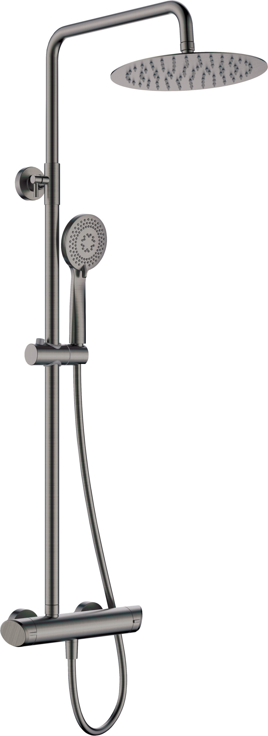 Deszczownica Arnika Titanium w efektownym, charakterystycznym dla tej kolekcji odcieniu ciemnej szarości, składa się ze ściennej baterii mieszaczowej z wygodnymi pokrętłami zamiast standardowej dźwigni, drążka o regulowanej wysokości, ustawionego asymetrycznie względem baterii, głowicy natryskowej oraz węża ze słuchawką prysznicową. Wąż o długości 1,5 m wyposażony został w system anty-twist zapobiegający jego skręcaniu, a słuchawka w system anti-calc ułatwiający utrzymanie jej w czystości. Dodatkowo użytkownik może dopasować ustawienie słuchawki do swoich potrzeb, dzięki możliwości regulacji wysokości i kąta nachylenia. Głowica natryskowa ma średnicę 25 cm, co gwarantuje przyjemną i komfortową kąpiel. Prezentowana deszczownia charakteryzuje się także szybką reakcją na włączanie i wyłączanie wody, dzięki czemu jest nie tylko ekologiczna, ale i ekonomiczna. Jej nowoczesny design oraz wyjątkowy kolor, nawiązujący do kolorów ziemi, spodobają się wszystkim miłośnikom minimalistycznych, skandynawskich i industrialnych wnętrz.