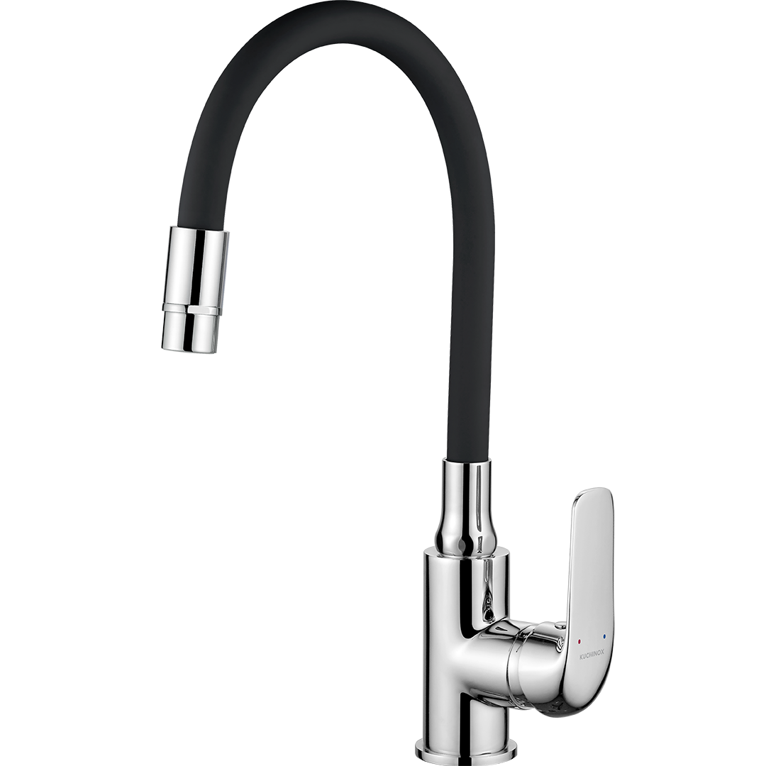 Baterie kuchenne serii Elza marki Kuchinox z elastyczną wylewką należą do rozwiązań efektownych wizualnie, a jednocześnie wyróżniają się dużą praktycznością podczas codziennego użytkowania w kuchni. Seria posiada elastyczne wylewki oraz dostępna jest w wersji sztorcowej stojącej i ściennej. Uniwersalna kolorystyka sprawia, że z łatwością można dobrać ją do każdej stylistyki kuchni, zarówno tej nowoczesnej, jak i utrzymanej w klasycznym tonie. Baterie posiadają chromowe elementy, dzięki czemu możemy dobrać baterię do stalowego zlewozmywaka. Natomiast elastyczne wylewki dostępne są w uniwersalnych kolorach tj. beżowy, szary oraz czarny, dzięki czemu możemy dopasować baterię do zlewozmywaka granitowego. Baterie z elastyczną wylewką łączą w sobie cechy funkcjonalności wraz z estetycznym wyglądem. Największą zaletą elastycznej wylewki jest jej plastyczność, umożliwiająca dowolne jej ustawienie, dzięki czemu możemy dotrzeć do trudnodostępnych miejsc naczyń o nietypowym kształcie. Kolejnym atutem jest wygodne mycie samego zlewu oraz swobodne obmywanie warzyw czy owoców. Baterie stojące Elza dostępne są w dwóch wersjach.Pierwsza opcja wyposażona jest w standardowy aerator, natomiast druga oferuje dwie funkcje strumienia, które można zmieniać za pomocą obrotu aeratora. W ofercie znajdują się również baterie z elastyczną wylewką F, dostępne w modnych kolorach, a także eleganckie, całkowicie czarne zestawy.