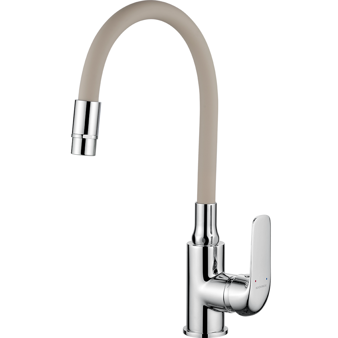 Baterie kuchenne serii Elza marki Kuchinox z elastyczną wylewką należą do rozwiązań efektownych wizualnie, a jednocześnie wyróżniają się dużą praktycznością podczas codziennego użytkowania w kuchni. Seria posiada elastyczne wylewki oraz dostępna jest w wersji sztorcowej stojącej i ściennej. Uniwersalna kolorystyka sprawia, że z łatwością można dobrać ją do każdej stylistyki kuchni, zarówno tej nowoczesnej, jak i utrzymanej w klasycznym tonie. Baterie posiadają chromowe elementy, dzięki czemu możemy dobrać baterię do stalowego zlewozmywaka. Natomiast elastyczne wylewki dostępne są w uniwersalnych kolorach tj. beżowy, szary oraz czarny, dzięki czemu możemy dopasować baterię do zlewozmywaka granitowego. Baterie z elastyczną wylewką łączą w sobie cechy funkcjonalności wraz z estetycznym wyglądem. Największą zaletą elastycznej wylewki jest jej plastyczność, umożliwiająca dowolne jej ustawienie, dzięki czemu możemy dotrzeć do trudnodostępnych miejsc naczyń o nietypowym kształcie. Kolejnym atutem jest wygodne mycie samego zlewu oraz swobodne obmywanie warzyw czy owoców. Baterie stojące Elza dostępne są w dwóch wersjach.Pierwsza opcja wyposażona jest w standardowy aerator, natomiast druga oferuje dwie funkcje strumienia, które można zmieniać za pomocą obrotu aeratora. W ofercie znajdują się również baterie z elastyczną wylewką F, dostępne w modnych kolorach, a także eleganckie, całkowicie czarne zestawy.