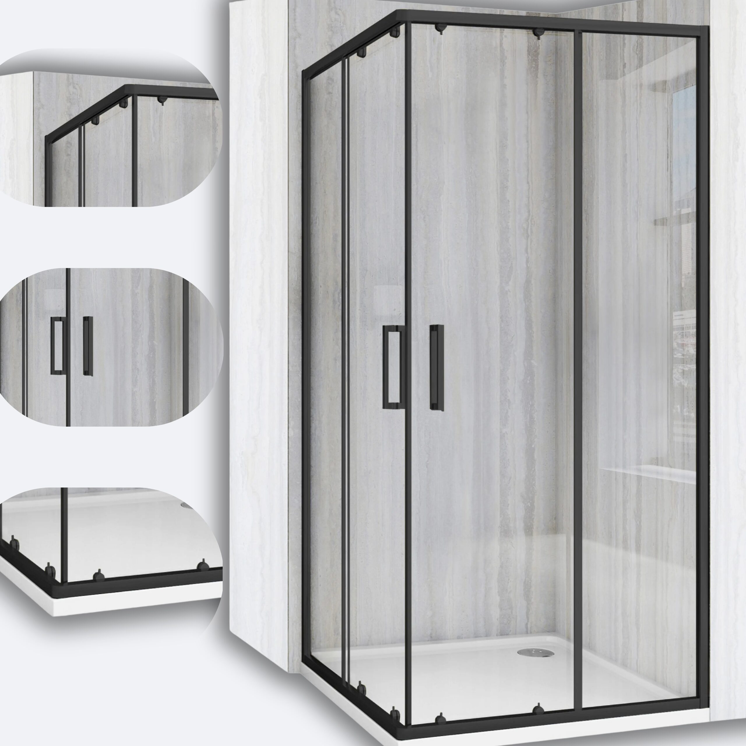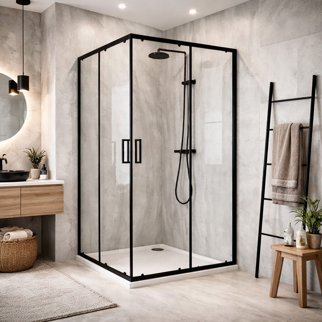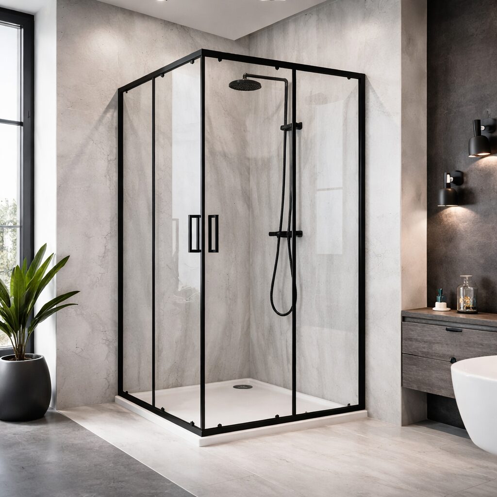 Rea City 90×90 to czarna kabina z drzwiami przesuwnymi, która łączy nowoczesny design z funkcjonalnością.