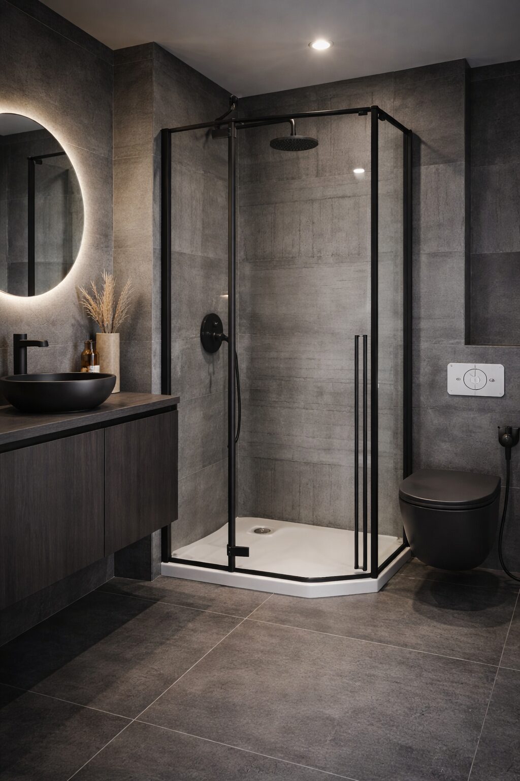 Geometria i czarne wykończenie sprawiają, że łazienka wygląda nowocześnie i bardziej „premium”.