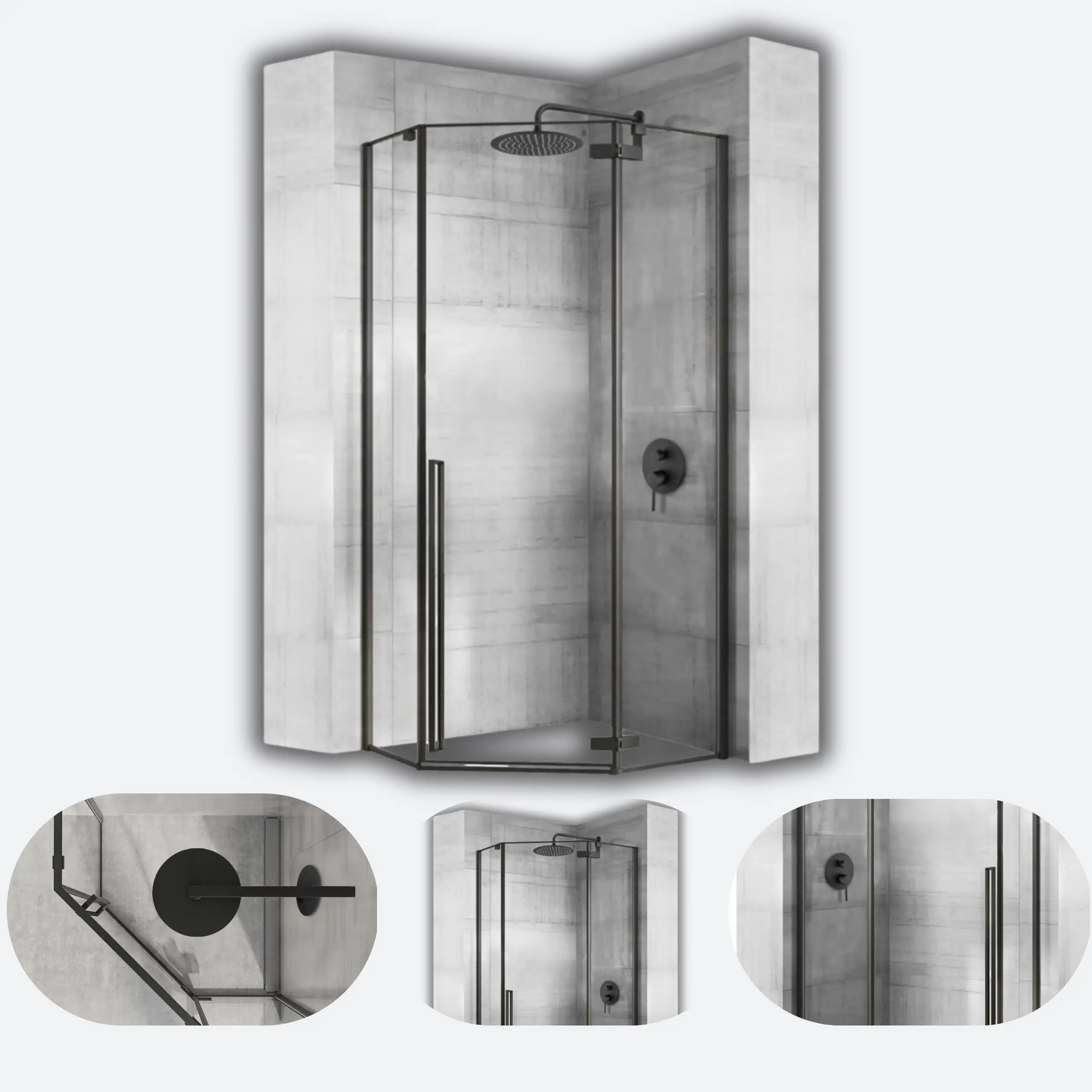 Model Diamond to narożna kabina z drzwiami uchylnymi i charakterystycznym czarnym profilem, która nadaje łazience nowoczesny wygląd.