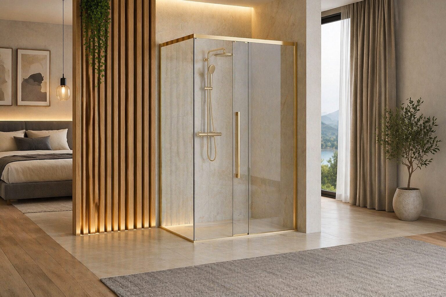 Kabina Solar w złotym wykończeniu łączy nowoczesny design z wygodą użytkowania dzięki drzwiom przesuwnym.