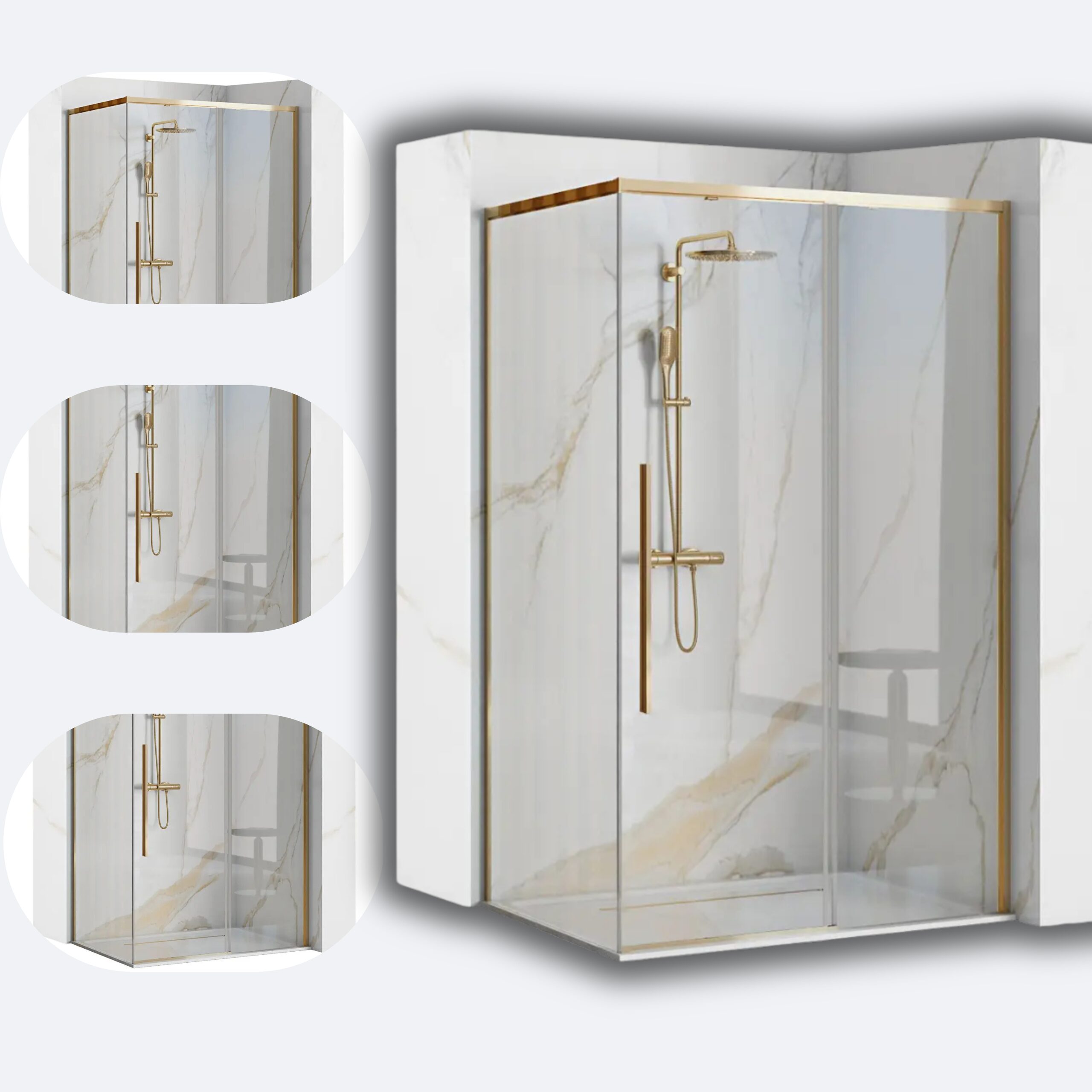 Złote wykończenie nadaje charakteru, a przesuwne drzwi sprawiają, że kabina jest wygodna nawet w mniejszych łazienkach.