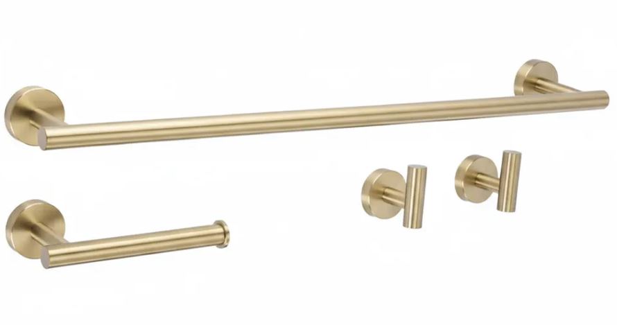 Wszystkie elementy wykonano z wysokiej jakości metalu, odpornego na wilgoć i korozję. Powierzchnia w kolorze złota szczotkowanego nadaje całości elegancji i subtelnego blasku, jednocześnie zachowując odporność na ślady użytkowania. Akcesoria są montowane na ścianie, co zapewnia stabilność, trwałość i komfort w codziennym korzystaniu.