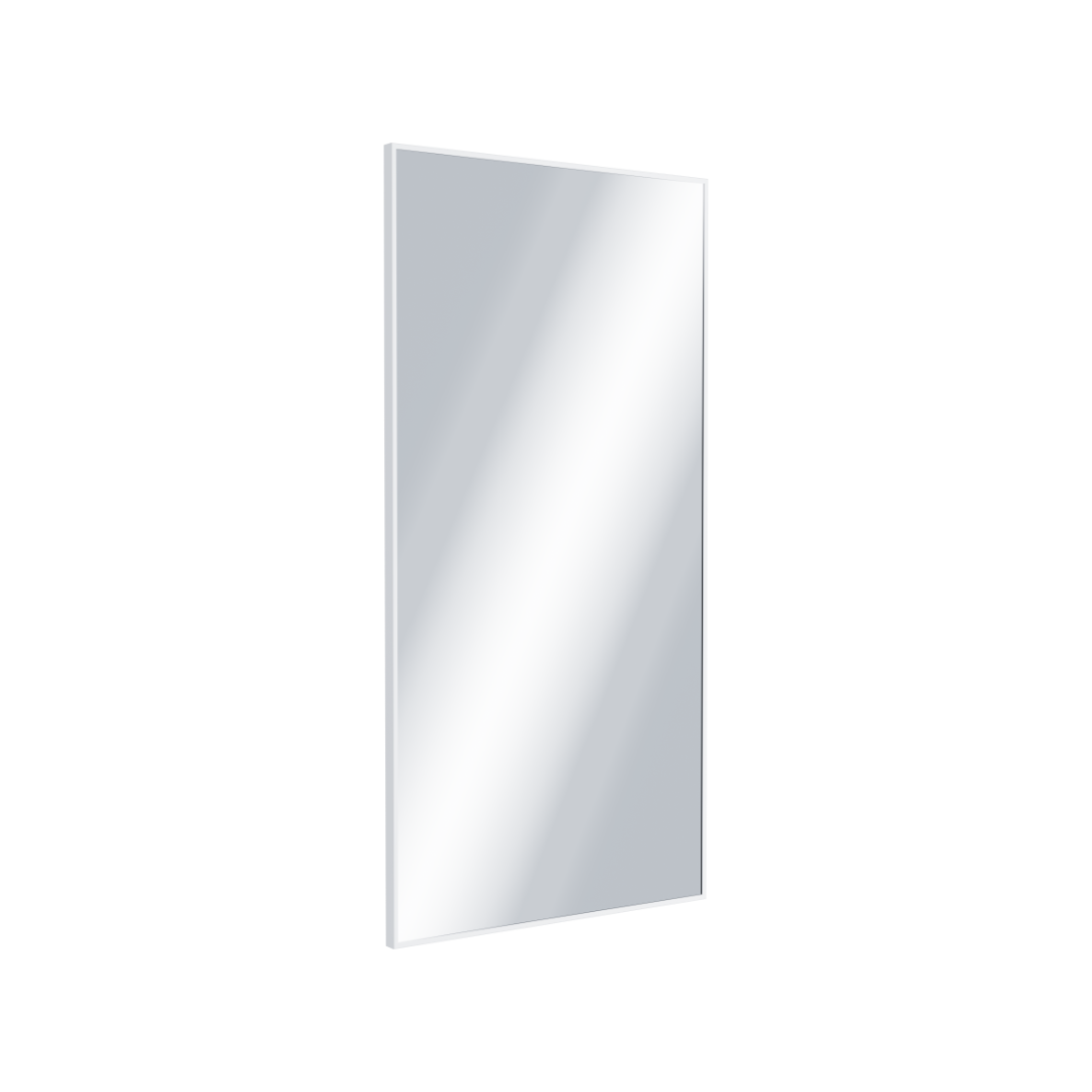 Tafla szkła jest dodatkowo zabezpieczona podklejoną z tyłu folią ochronną, która w razie stłuczenia lustra niweluje możliwość rozpryśnięcia się odłamków szkła i skaleczenia przez użytkownika. Dostępne rozmiary luster: 1000 x 500 mm oraz 800 x 600 mm. Dostępne kolory ramy: anoda czarny mat lub złota szczotkowana oraz lakierowany biały mat.
