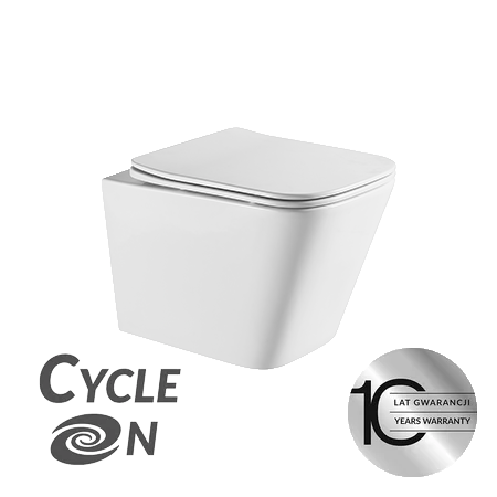 Wisząca miska WC Kvadrato CycleON to produkt z systemem CycleON, wykorzystujący innowacyjną technologię spłukiwania wirowego z silnym strumieniem wody. Niezależne testy wykazały, że ta nowa metoda skutecznie czyści wewnętrzną powierzchnię miski toaletowej, przy zużyciu jedynie 4 lub 6 litrów wody.