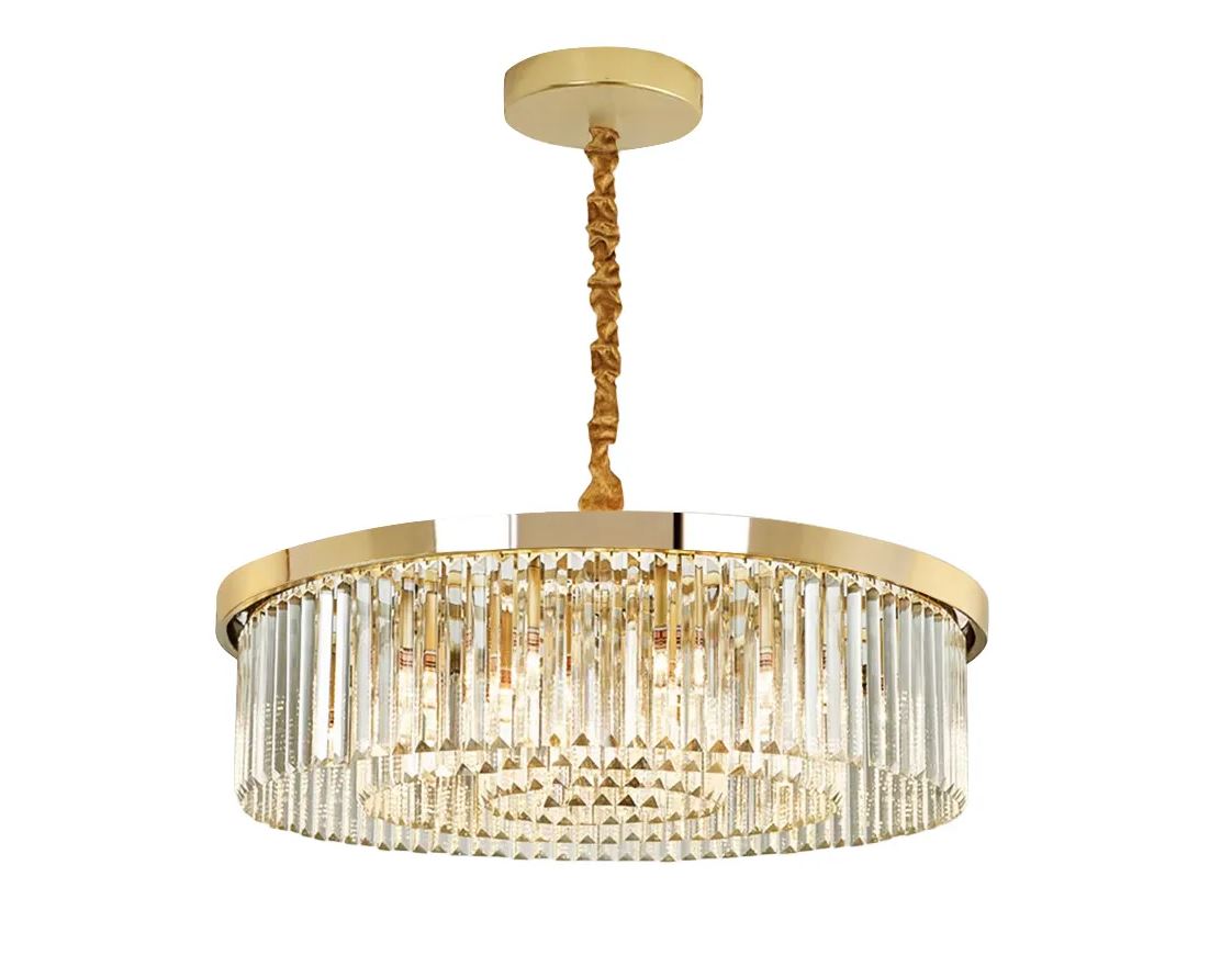 Lampa kryształowa w złotym wykończeniu to elegancki element dekoracyjny, który zachwyca swoją formą i jakością wykonania. Jej okrągła konstrukcja z metalową ramą w złotym kolorze doskonale współgra z kryształowymi detalami, tworząc efektowne oświetlenie pełne blasku. Światło przenikające przez liczne kryształowe elementy rozprasza się w pomieszczeniu, nadając mu wyjątkowy, luksusowy charakter.