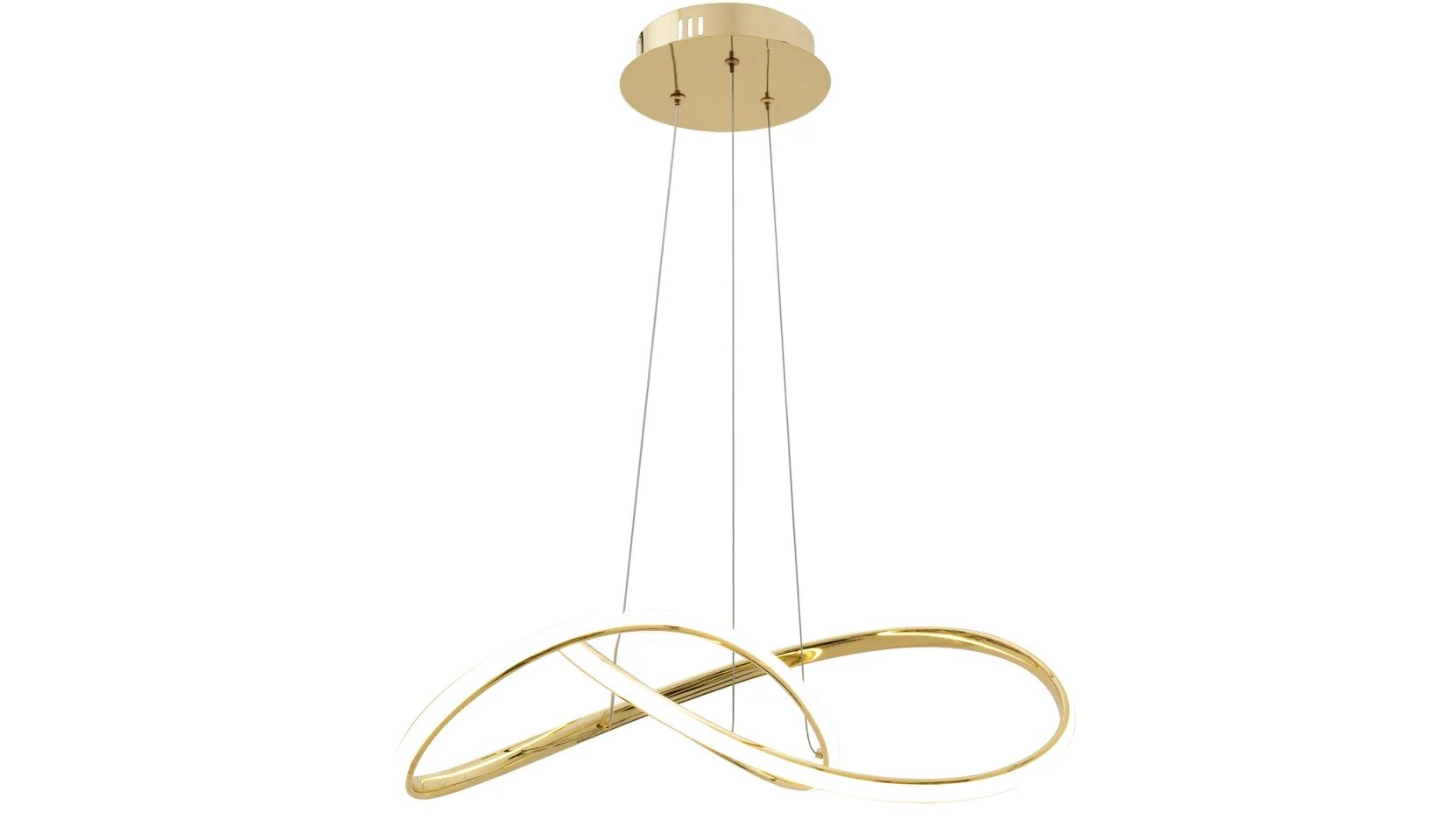 Nowoczesna lampa Led wisząca w złotym wykończeniu to harmonijne połączenie minimalistycznego designu i luksusowego akcentu. Jej dynamiczna, przestrzenna forma w kształcie przecinających się okręgów tworzy niepowtarzalną kompozycję, która doskonale wpisuje się w trendy współczesnych wnętrz. Dzięki zastosowaniu zintegrowanego oświetlenia Led, lampa zapewnia nie tylko efektowny wygląd, ale także energooszczędne i równomierne światło. Idealnie sprawdzi się w salonie, jadalni czy przestrzeniach komercyjnych, takich jak restauracje czy hotele, nadając wnętrzu wyrafinowanego stylu i unikalnego charakteru.