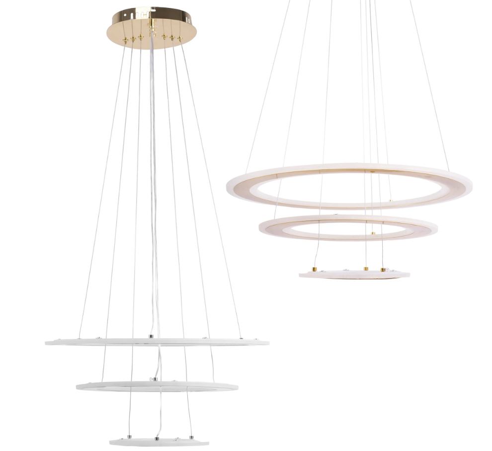 Lampa wisząca o nowoczesnym, minimalistycznym designie z trzema pierścieniami świetlnymi zawieszonymi na cienkich linkach. Jej elegancka forma oraz wykończenie w odcieniu bieli i złota sprawiają, że doskonale komponuje się z nowoczesnymi i luksusowymi wnętrzami. Idealna do salonu, jadalni lub przestrzeni komercyjnych. Możliwość regulacji wysokości zawieszenia pozwala na dopasowanie do różnych pomieszczeń.