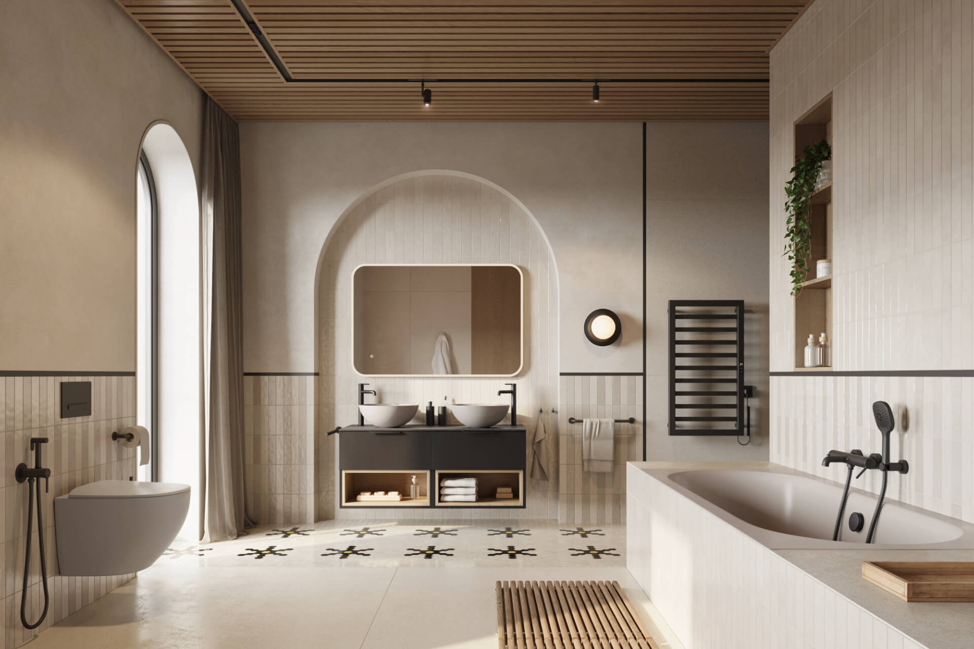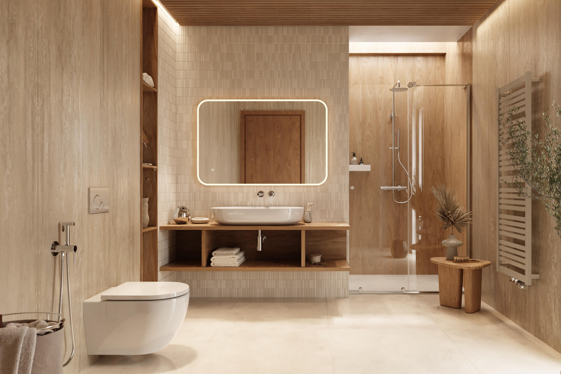 Prostokątne lustro 100 x 70 cm wyposażone jest w zintegrowane oświetlenie LED z płynną zmianą barwy światła w zakresie 3000–6000 K. Użytkownik może dostosować zarówno temperaturę barwową, jak i poziom intensywności światła, tworząc optymalne warunki do codziennej pielęgnacji czy wykonywania makijażu. Oświetlenie ukryte zostało pod akrylową, przezroczystą osłoną, która zapewnia równomierne rozproszenie światła bez widocznych punktów diod LED, podkreślając elegancki charakter i dbałość o detale.
