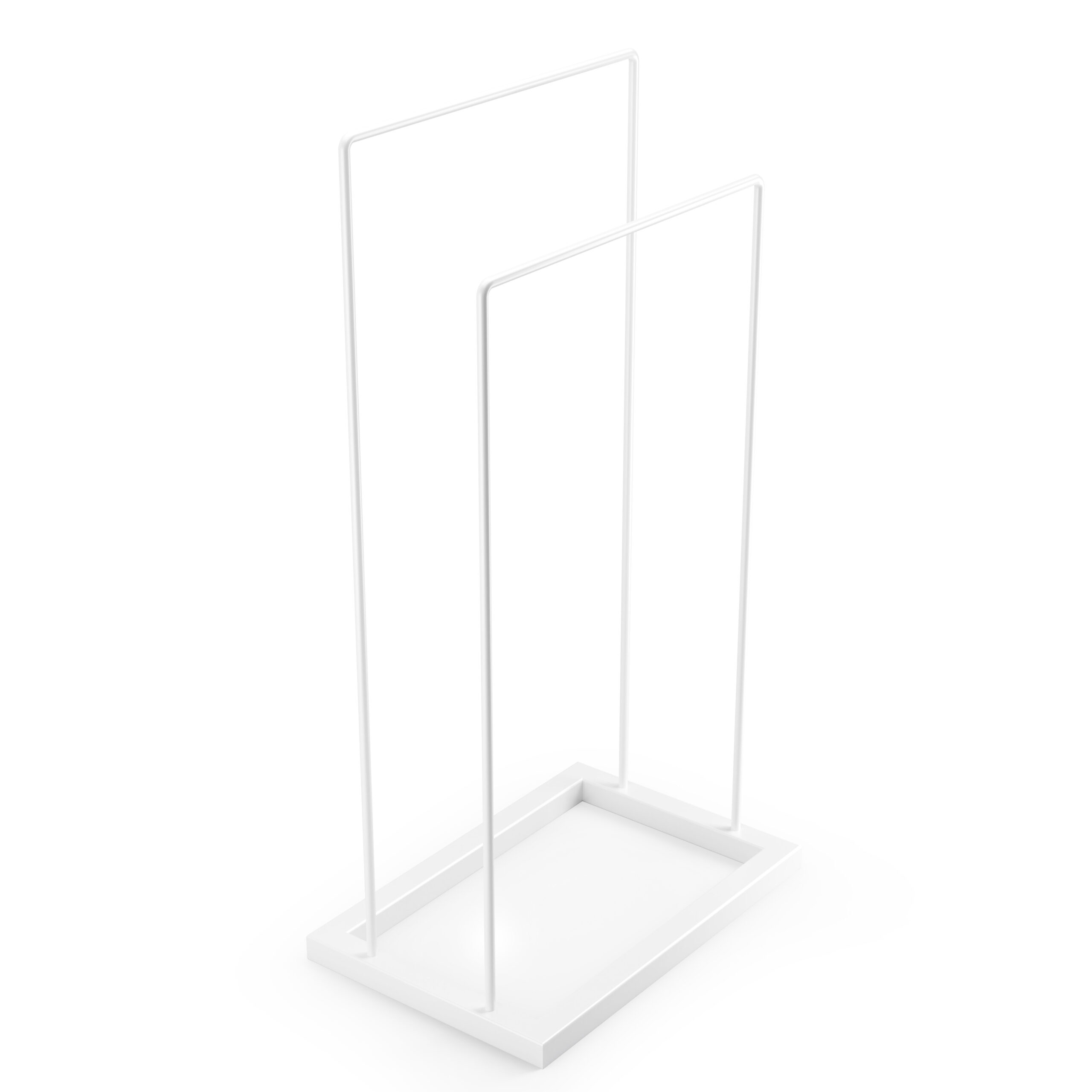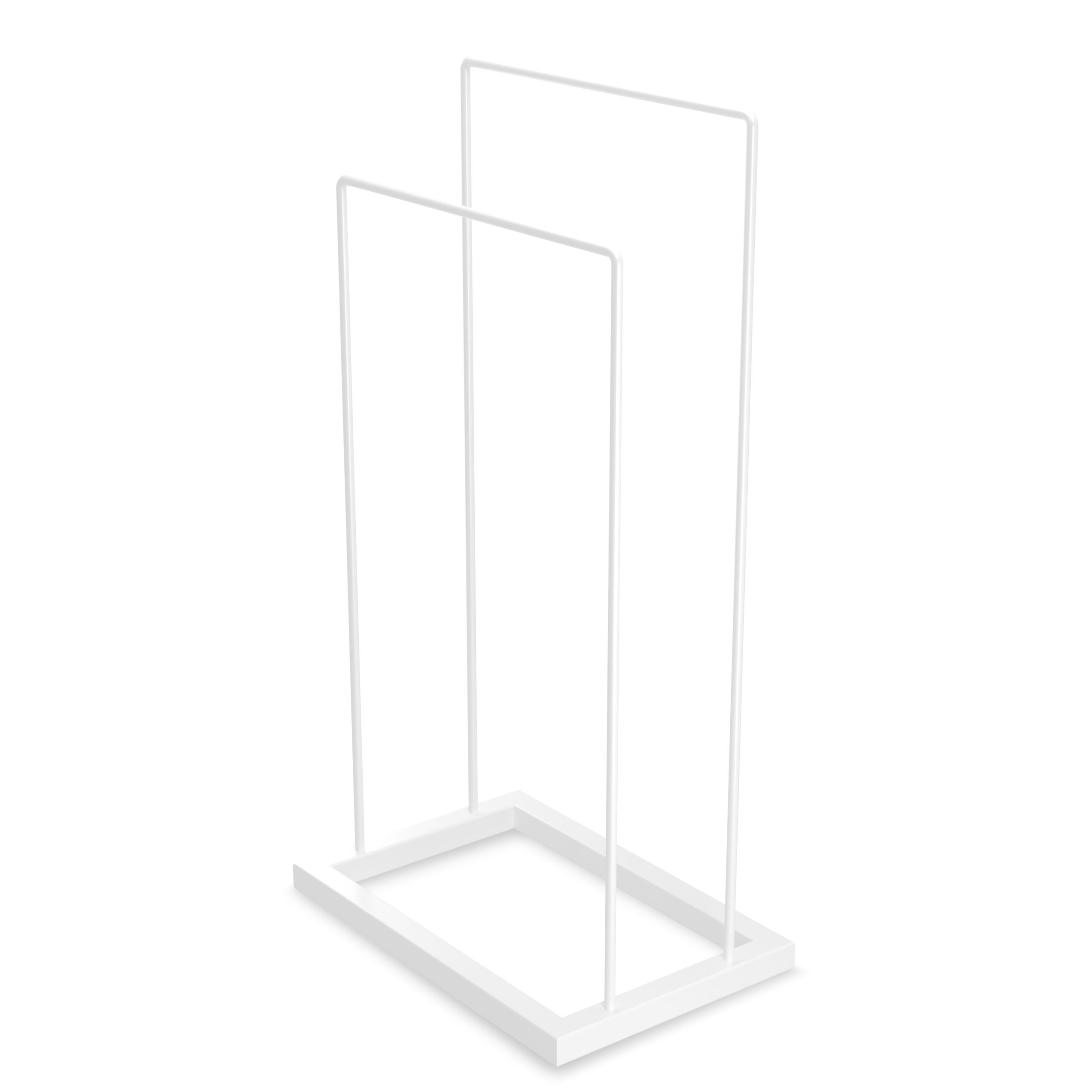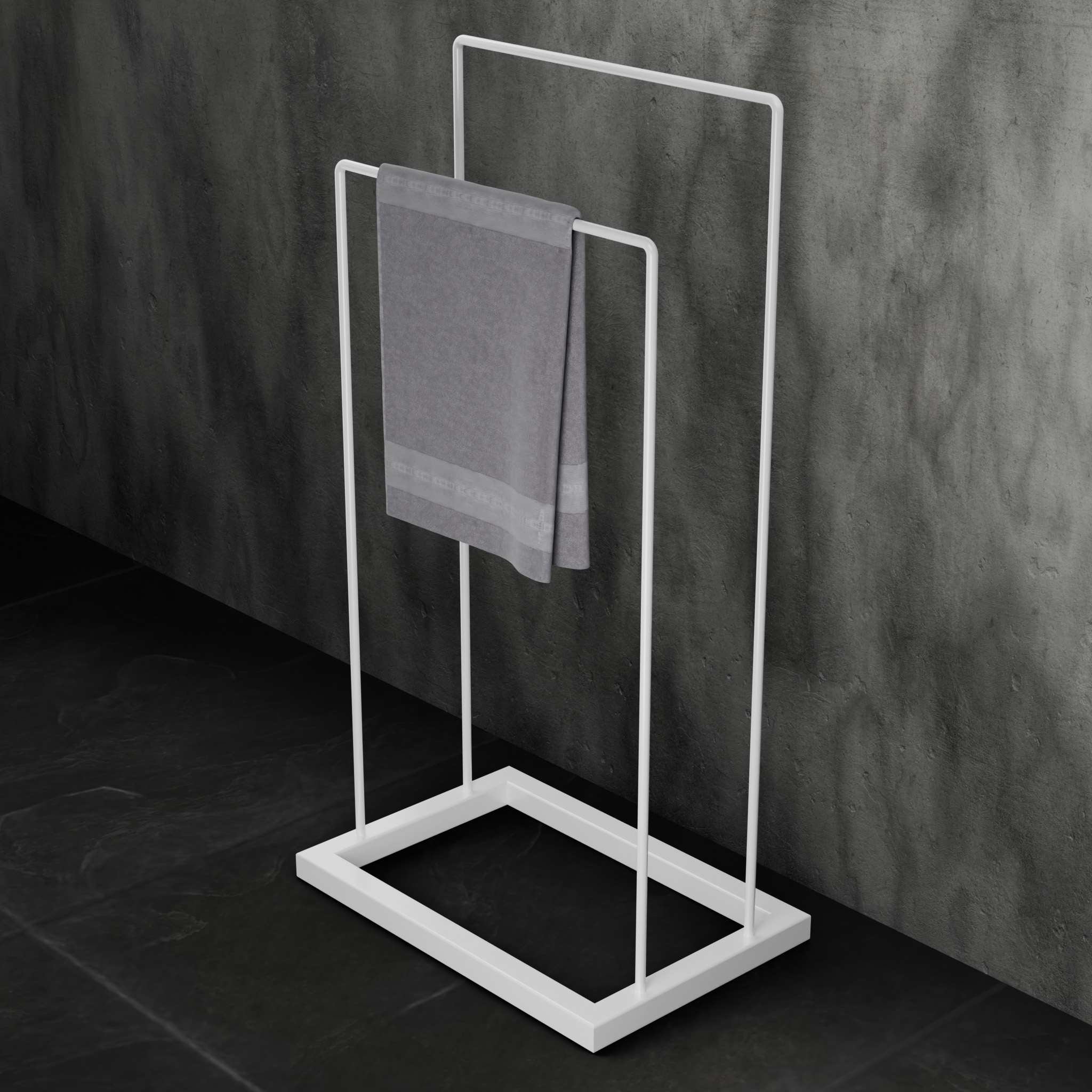 Stojak wyposażony jest w dwie poprzeczki na różnych wysokościach, co pozwala wygodnie rozwiesić kilka ręczników jednocześnie. Dzięki temu szybciej schną i zawsze pozostają w zasięgu ręki.