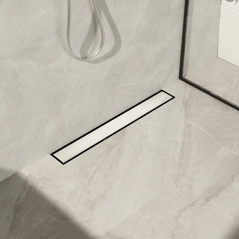 Dwustronny panel frontowy umożliwia montaż płytki, dzięki czemu odpływ doskonale komponuje się z posadzką.