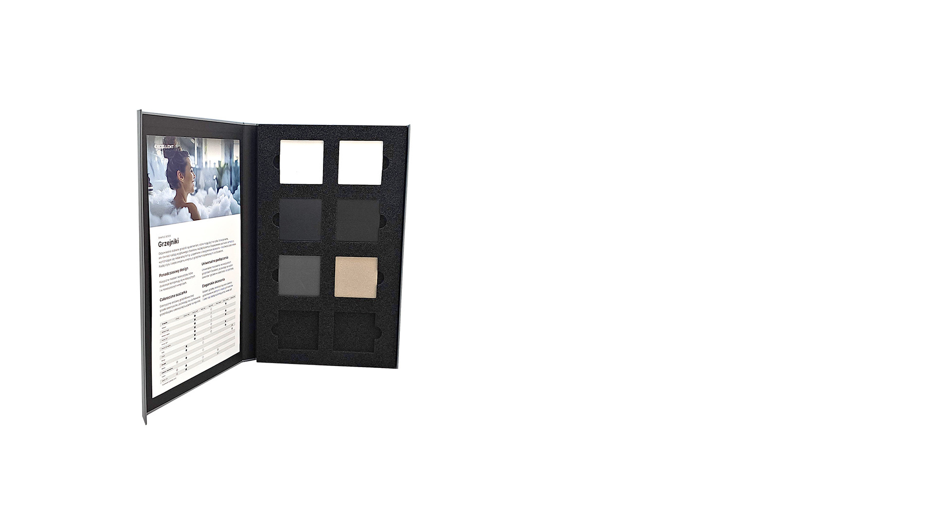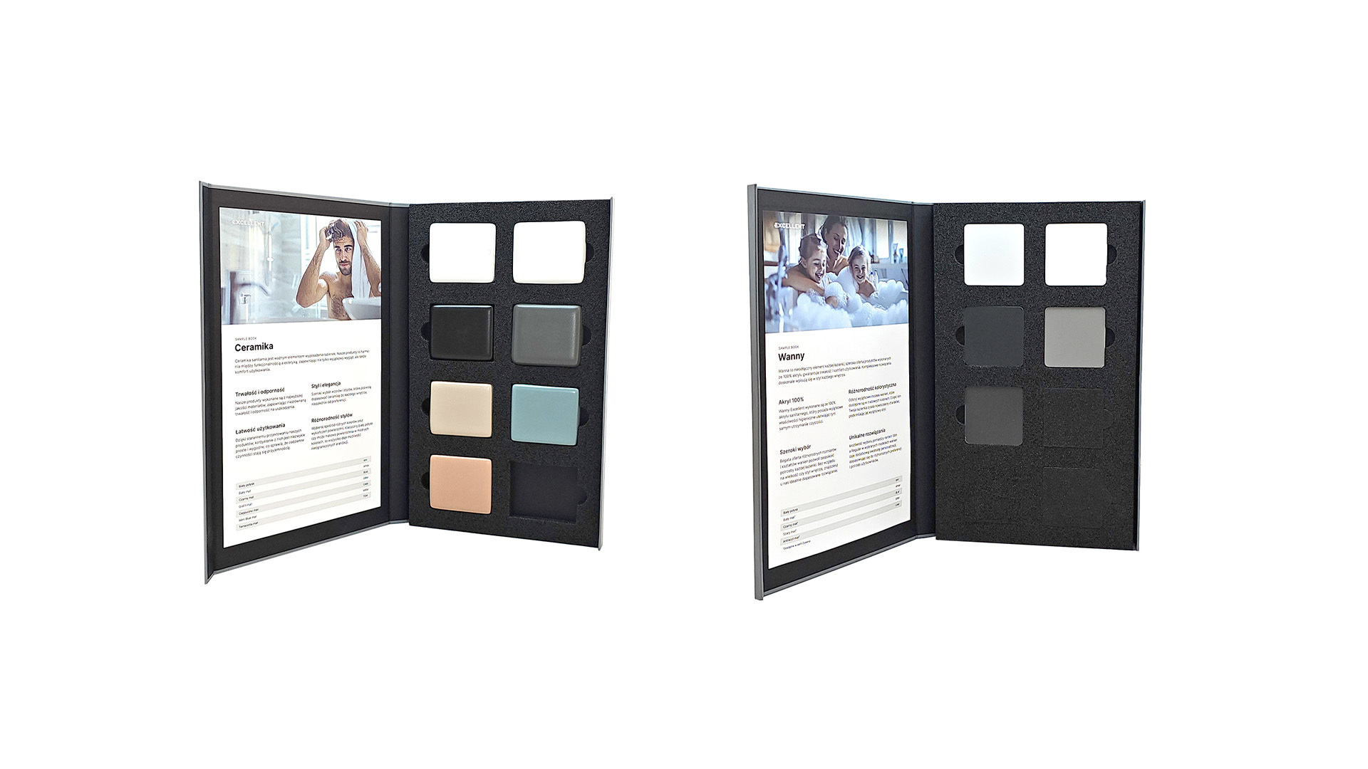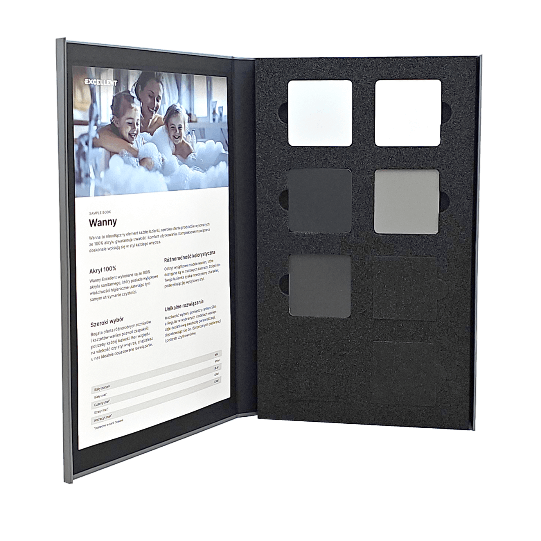 Ten kompaktowy wzornik oferuje bogaty wybór kolorów i wykończeń, które ułatwiają przedstawienie klientom różnych możliwości stylistycznych, od klasycznej elegancji po nowoczesny minimalizm. Dzięki temu projektowanie staje się bardziej precyzyjne, a efekt końcowy spełnia najwyższe standardy estetyki i funkcjonalności.