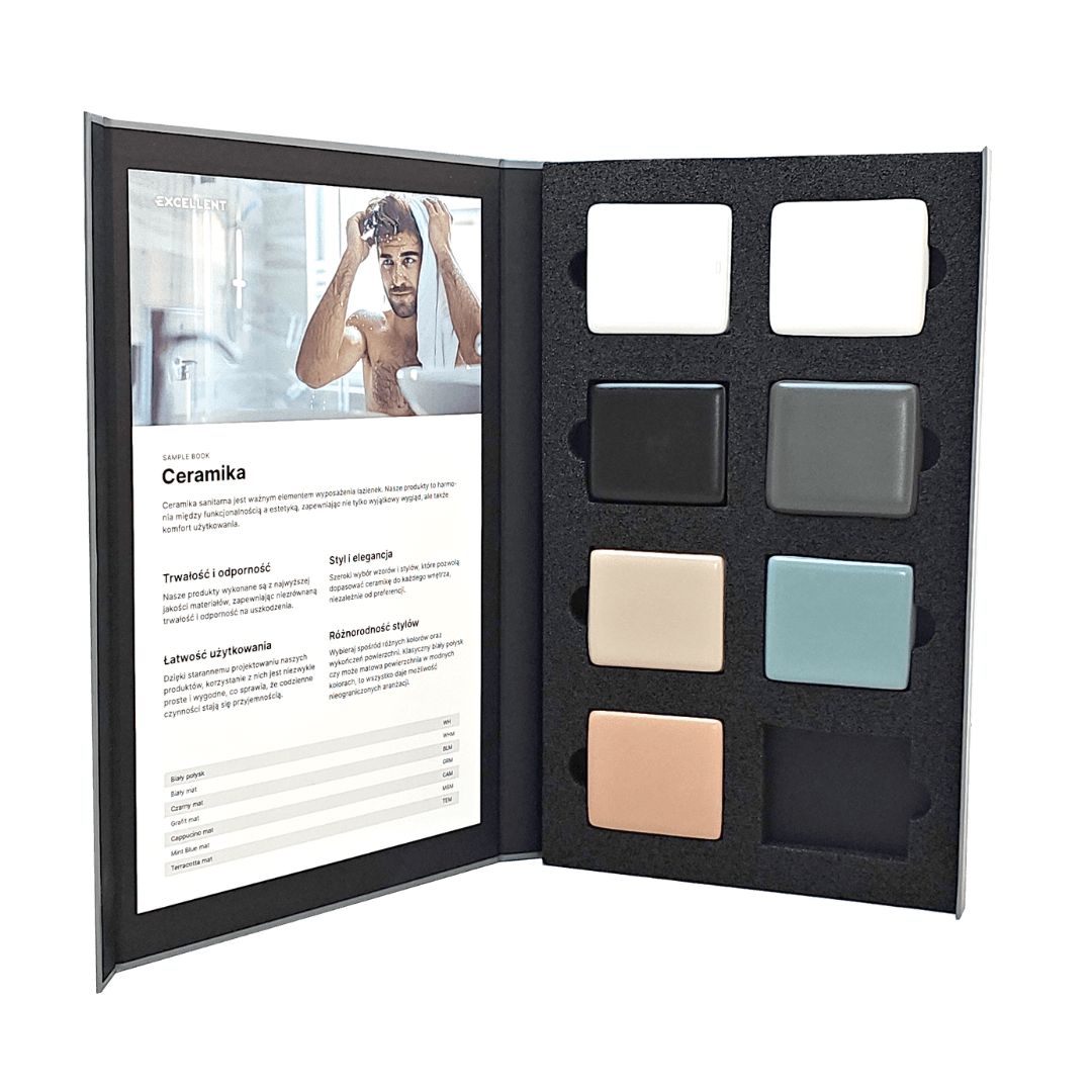 Dzięki niemu z łatwością dopasujesz odcień ceramiki do reszty aranżacji wnętrza, zapewniając spójność wizualną. Próbnik ten obejmuje szeroką paletę kolorów i tekstur, co daje pełną kontrolę nad finalnym wyglądem projektu, jednocześnie spełniając wymagania nawet najbardziej wymagających klientów.