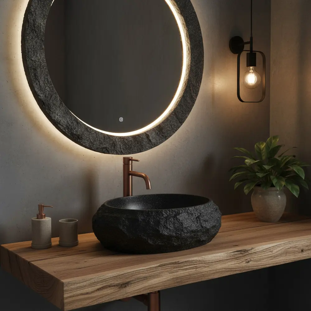 Gładkie wnętrze misy gwarantuje łatwość utrzymania w czystości, a surowa, kamienna faktura zewnętrzna dodaje wnętrzu charakteru i niepowtarzalnego uroku. To propozycja dla osób poszukujących eleganckiego, designerskiego elementu wyposażenia łazienki, który będzie równie praktyczny, co efektowny.
