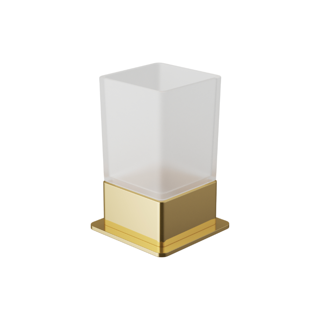 Kubek z mrożonego szkła i podstawka z wysokogatunkowego mosiądzu pokrytego złotą powłoką wykonaną w technologii PVD. Jest to efektowny produkt, który pięknie uzupełnia wystrój łazienki utrzymanej w nowoczesnym stylu. Atrakcyjnie się prezentuje zarówno na delikatnej, szklanej półce, jak i lśniącej, ceramicznej umywalce. Dzięki praktycznej, plastikowej obręczy wewnątrz podstawki kubek jest odpowiednio zabezpieczony – dlatego nie musisz obawiać się ewentualnych pęknięć lub zarysowań. Codzienna, rutynowa higiena sprawia o wiele więcej przyjemności, gdy korzystasz przy niej z estetycznego kubka RIKO.