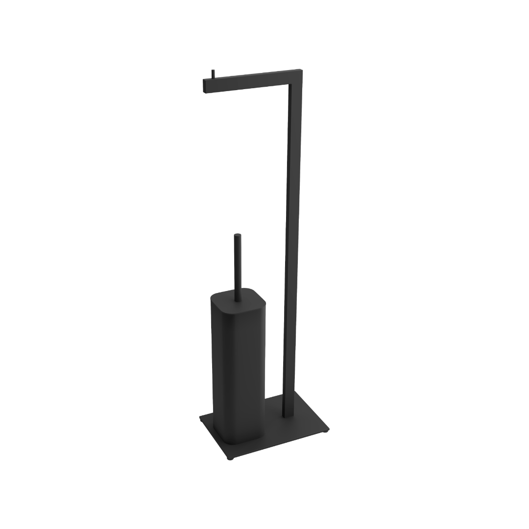 Stojak na papier toaletowy ze szczotką składa się z metalowego pojemnika, szczotki w kolorze czarnym mat z uchwytem oraz uchwytu na papier toaletowy.