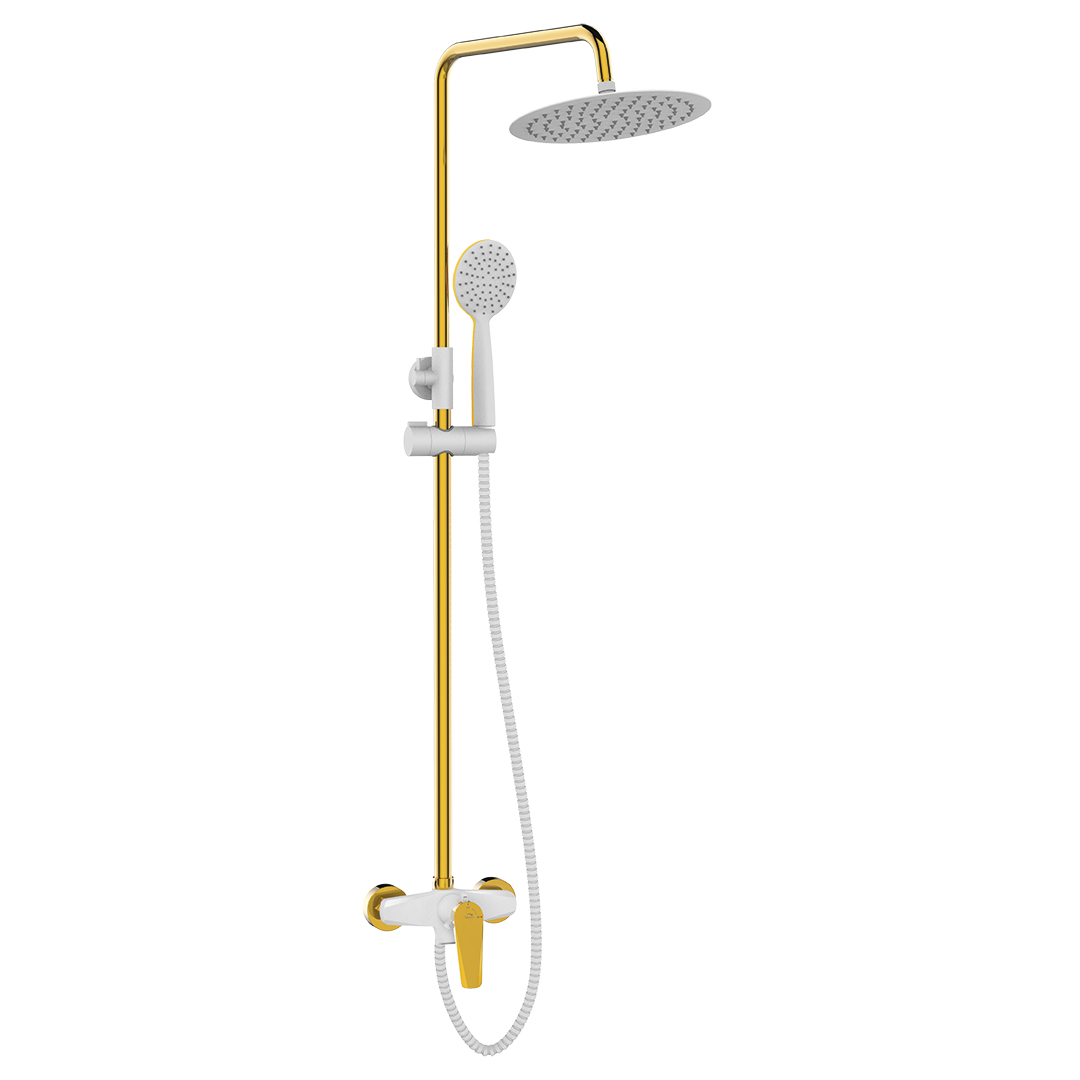 Kolumna natryskowa Rubio to uzupełnienie serii. Wielofunkcyjny zestaw prysznicowy to model dla wymagających klientów, którzy oczekują najwyższego komfortu podczas kąpieli. Kolumna świetnie sprawdzi się przy wannach wyposażonych w parawan. Model zawiera kilka elementów, dzięki którym sprawdzi się niezależnie od potrzeb. Uniwersalna słuchawka prysznicowa z nowoczesną ruchomą deszczownią, zapewnią szybki prysznic, natomiast wannowa wylewka o kaskadowym wypływie wody, wypełni wannę. Wybór strumienia następuje poprzez trójstopniowy pierścień zamontowany tuż przy dźwigni. Kolumna dostępna w dwóch wariantach kolorystycznych: czarny w połączeniu ze złotem oraz białe wykończenie ze złotem. Dodatkowym atutem kolumny jest zimny start, który pozwoli na wypływ zimnej, nie zmieszanej z ciepłą, wody. Słuchawka natryskowa wraz z deszczownią wyposażone zostały w system pozwalający na szybkie usunięcie osadu kamiennego. Na szczególną uwagę zasługuje nieplączący się wąż z system antyskręt oraz regulowany drążek pozwalający dostosować wysokość do użytkownika.