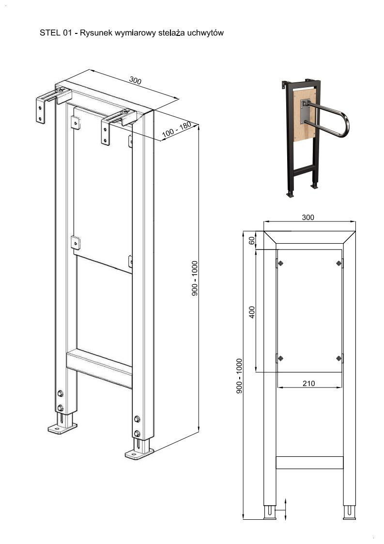 Montaż: Stelaż umożliwia regulację wysokości mocowania w granicach 100 mm, oraz ma możliwość regulacji głębokości w zakresie 80 mm.