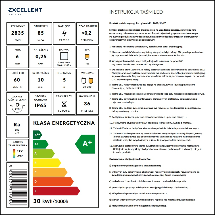 Taśma LED o stopniu ochrony IP65 z wydłużonym okresem gwarancji do 3 lat! Taśmy charakteryzują się mniejszymi spadkami napięcia dzięki zastosowanemu podkładowi PCB o zawartości miedzi 3oz. Taśmy posiadają dwustronną taśmę montażową Blue Tape.