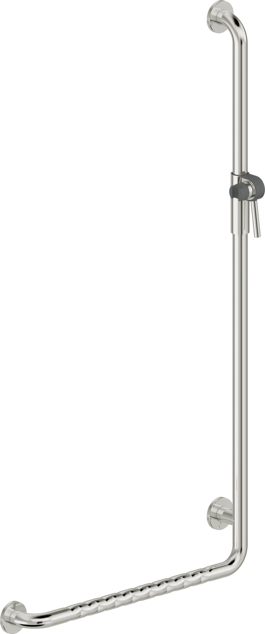 Uchwyt przyścienny kątowy, prawy wyposażony jest w regulowany uchwyt na słuchawkę prysznicową. Produkt wykonany został z wysokogatunkowej stali nierdzewnej. Pionowe ramię jest gładkie, poziome ma powierzchnię falistą. W komplecie zestaw montażowy do twardego podłoża (ściany z pełnej cegły/ betonu). Maksymalny udźwig 150 kg. Produkt jest wyrobem medycznym.