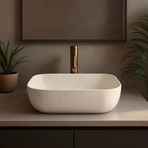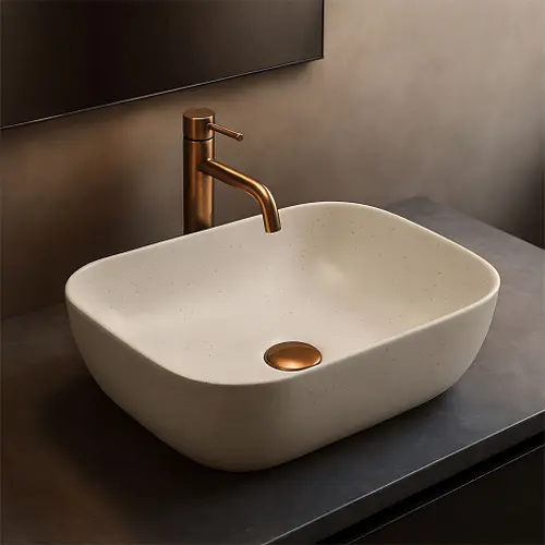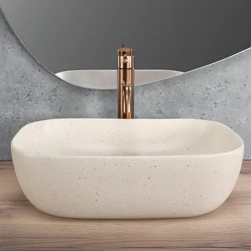Umywalka nablatowa Belinda Sandy o wyjątkowej strukturze inspirowanej naturalnym kamieniem to doskonałe połączenie elegancji i surowego piękna. Jej design idealnie pasuje do łazienek w stylu naturalnym, spa, japandi czy boho.