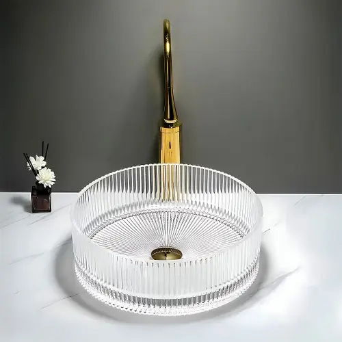 Umywalka nablatowa Ingrid 36 to propozycja dla osób, które poszukują eleganckiego i niebanalnego rozwiązania do swojej łazienki. Wykonana z wysokiej jakości szkła, zachwyca ryflowaną powierzchnią oraz transparentnym wykończeniem, które nadaje wnętrzu wyjątkowego charakteru i luksusowego stylu.