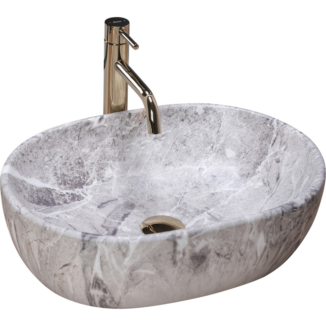 Piękna umywalka imitująca kamień. Dzięki technice w jakiej została wykonywana wierzchnia warstwa umywalki, każdy egzemplarz posiada niepowtarzalny i unikalny wzór. Efekt ten imituje naturalny kamień.