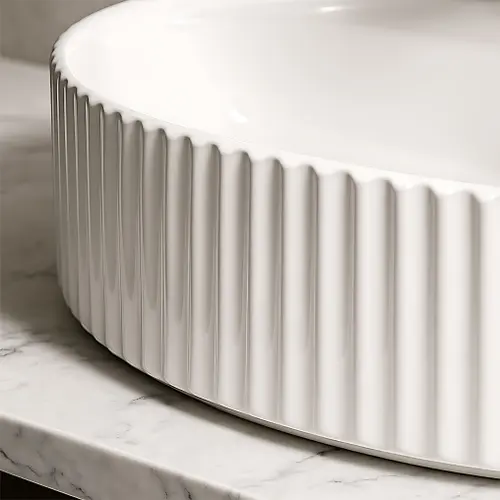 Umywalka nablatowa ryflowana Marcela to eleganckie połączenie funkcjonalności i nowoczesnego designu. Wykonana z wysokiej jakości ceramiki sanitarnej, charakteryzuje się trwałością, odpornością na zarysowania oraz łatwością czyszczenia. Jej owalny kształt z dekoracyjnymi, pionowymi ryflowaniami na zewnętrznych ściankach nadaje wnętrzu wyjątkowego charakteru i subtelnej faktury, która podkreśla styl aranżacji.