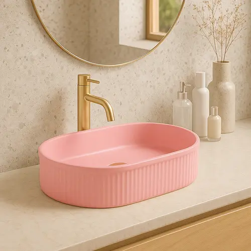 Umywalka nablatowa w kolorze różowym Bubble Gum Matt to stylowe rozwiązanie, które nada łazience nowoczesny charakter i podkreśli jej wyjątkowy wystrój. Matowa powierzchnia w pastelowym odcieniu różu sprawia, że model wyróżnia się subtelną elegancją i doskonale wpisuje się w aktualne trendy aranżacyjne. Wykonana z wysokiej jakości ceramiki sanitarnej, umywalka łazienkowa jest odporna na codzienne użytkowanie i łatwa w utrzymaniu czystości. Jej ryflowana powierzchnia zewnętrzna tworzy efektowną dekorację, która łączy funkcjonalność z niepowtarzalnym designem, czyniąc z niej idealny wybór do nowoczesnych łazienek.