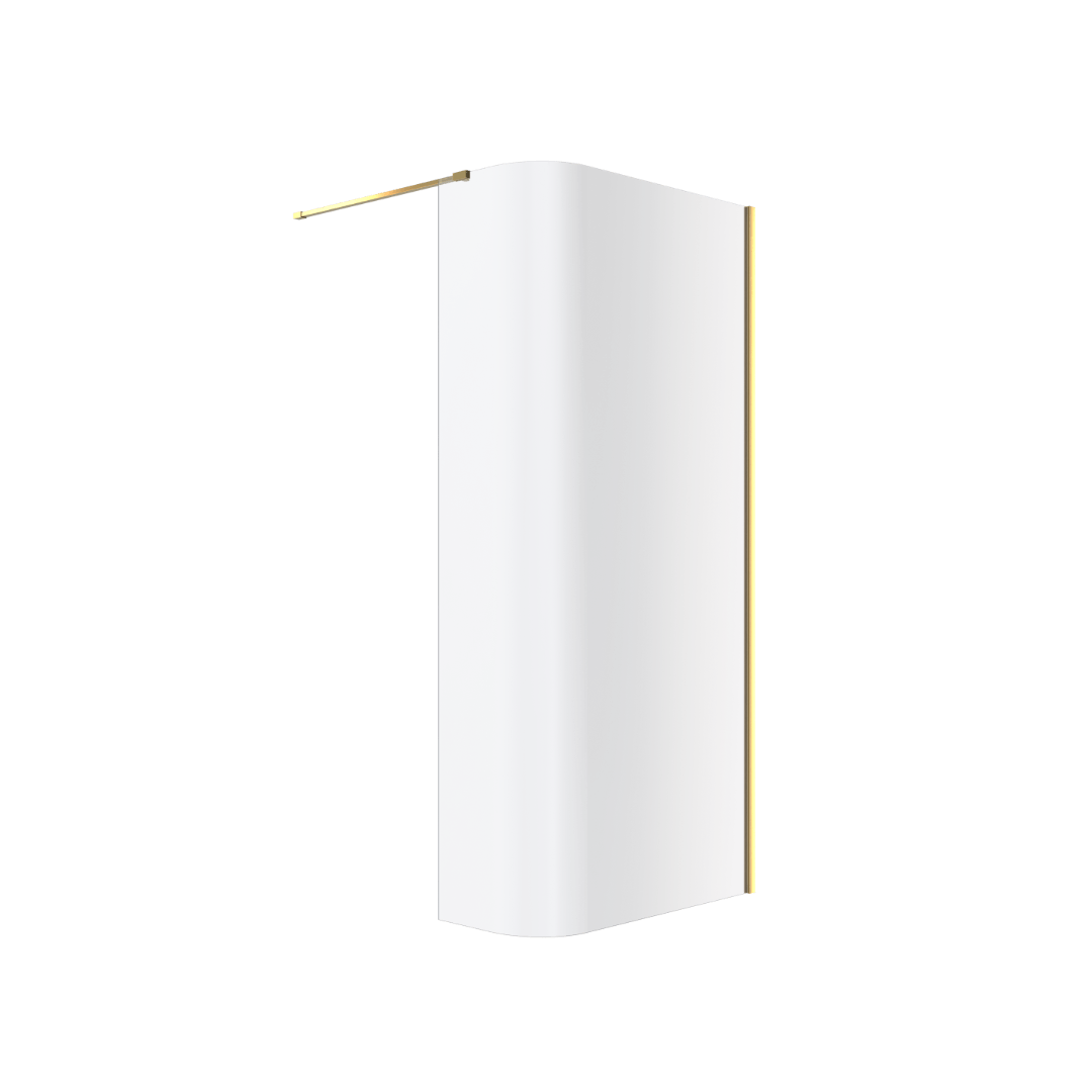 Ścianka gięta typu walk-in to świetne rozwiązanie dla osób ceniących nowoczesność i funkcjonalne rozwiązania. Tą minimalistyczną ściankę można zamontować pojedynczo lub w połączeniu ze ścianką prostą – dzięki temu tworząc gotową kabinę Walk-In, która ma wiele zalet. Zastosowany profil i akcesoria są perfekcyjnie dopasowane kolorystycznie i komponują się z pozostałymi elementami wyposażenia łazienki w kolorze złoty połysk.