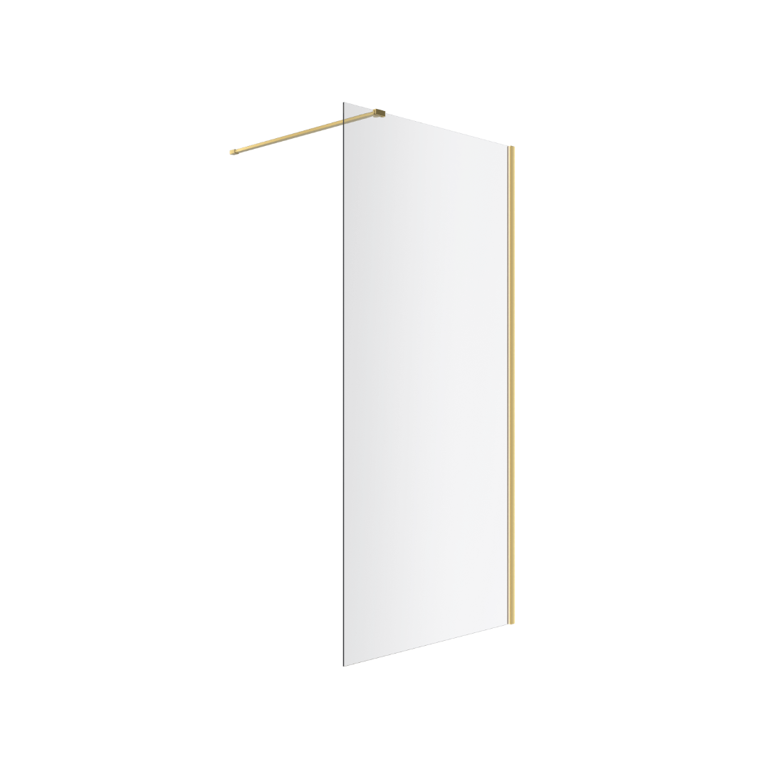 Ścianka prysznicowa prosta typu Walk-in to świetne rozwiązanie dla osób ceniących nowoczesność i funkcjonalne rozwiązania. Tą minimalistyczną ściankę można zamontować pojedynczo lub w połączeniu z drugą ścianką prostą lub ze ścianką giętą – dzięki temu tworząc zabudowaną kabinę Walk-In, która ma wiele zalet. Zastosowany profil i akcesoria są perfekcyjnie dopasowane kolorystycznie i komponują się z pozostałymi elementami wyposażenia łazienki w kolorze złoty połysk.