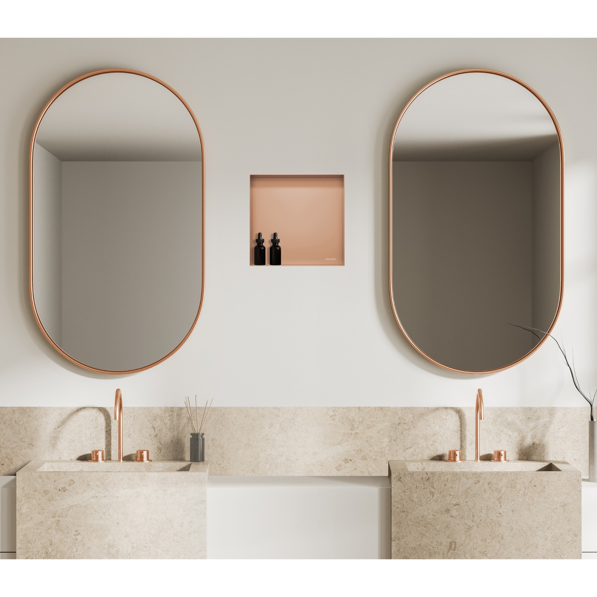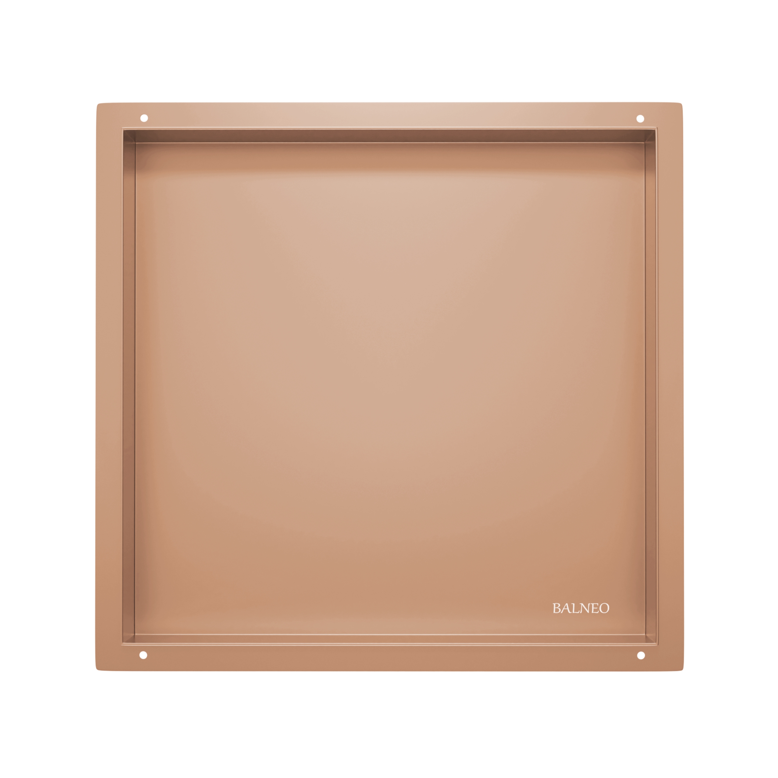 Półki wnękowe WALL-BOX NO RIM Copper pozwalają uporządkować przestrzeń w łazience i nadają jej nowoczesnego designu. Na łatwo dostępnych półkach można ustawić kosmetyki, perfumy, a w kabinie prysznicowej – szampony, żele i inne artykuły kąpielowe.