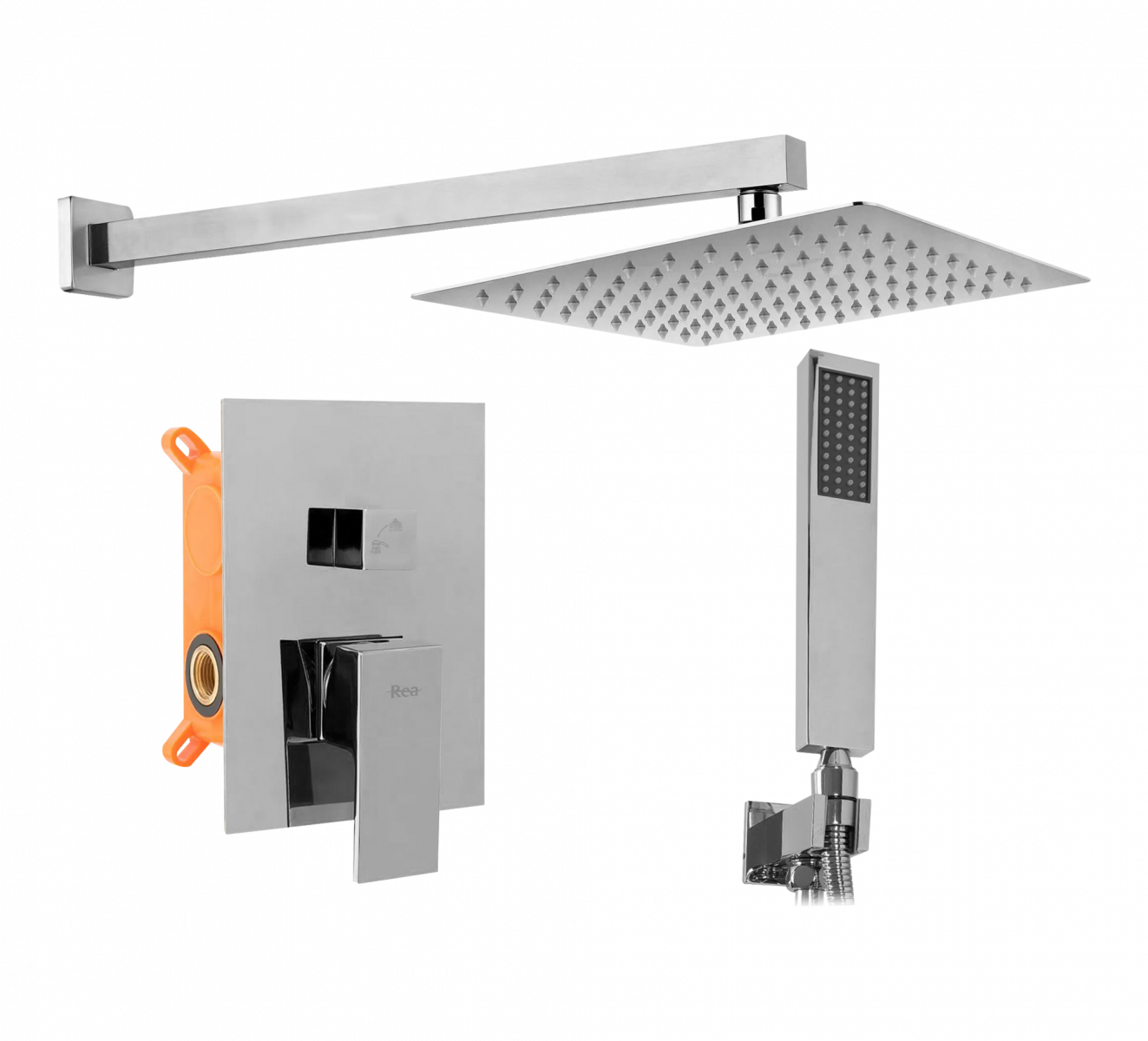 W komplecie znajduje się Ultra Cienka 2mm deszczownica kwadratowa 25 cm, bateria z elementami natynkowymi oraz podtynkowymi, wąż ze słuchawką oraz zestawem punktowym.