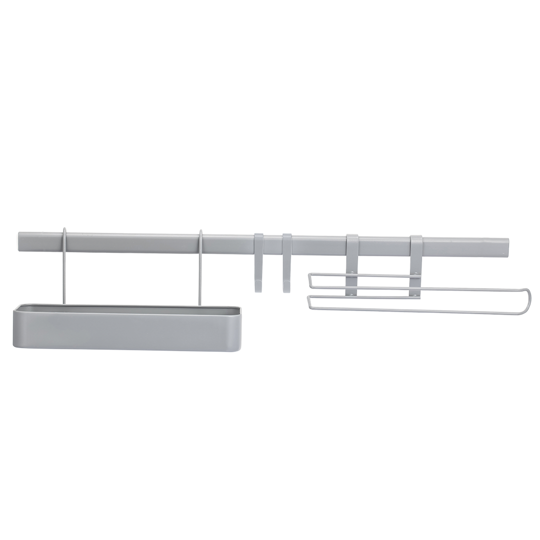 Relingi z wysokiej wytrzymałości stali oraz akcesoria stanowią nieodzowny dodatek wyposażenia kuchni o niewielkich gabarytach z dużą ilością szafek. Szeroka gama modeli w łatwy sposób pomoże nam uporządkować zarówno przybory kuchenne, jak i inne rzeczy obowiązkowo znajdujące się w naszych szufladach. Zyskujemy więcej wolnej przestrzeni na kuchennym blacie, dzięki możliwości stworzenia zestawu według własnej kompozycji. Wszelkie pojemniki, póki, wieszaki, uchwyty oraz półki na ręcznik papierowy można skomponować z relingami występującymi w różnych rozmiarach poprzez zawieszenie ich specjalnych haczykach czy bezpośrednio na relingu. Kolekcja dostępna jest w różnych wykończeniach kolorystycznych.
