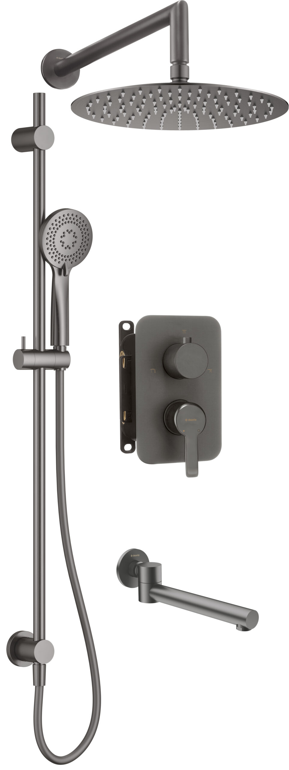 Komplet podtynkowy Arnika składa się z drążka ze słuchawką i głowicą deszczową, ze składanej wylewki oraz z boxa mieszaczowego z przełącznikiem natrysku. Uchwyt słuchawki można przesuwać do dowolnej pozycji. Słuchawka oraz głowica deszczowa wyposażone są w system Anti – calc, co ułatwia czyszczenie ich z osadu i kamienia. Wylewkę można podczas kąpieli złożyć równolegle do ściany, zyskując dodatkowe miejsce. Komplet wykończony jest w oryginalnym kolorze titanium.