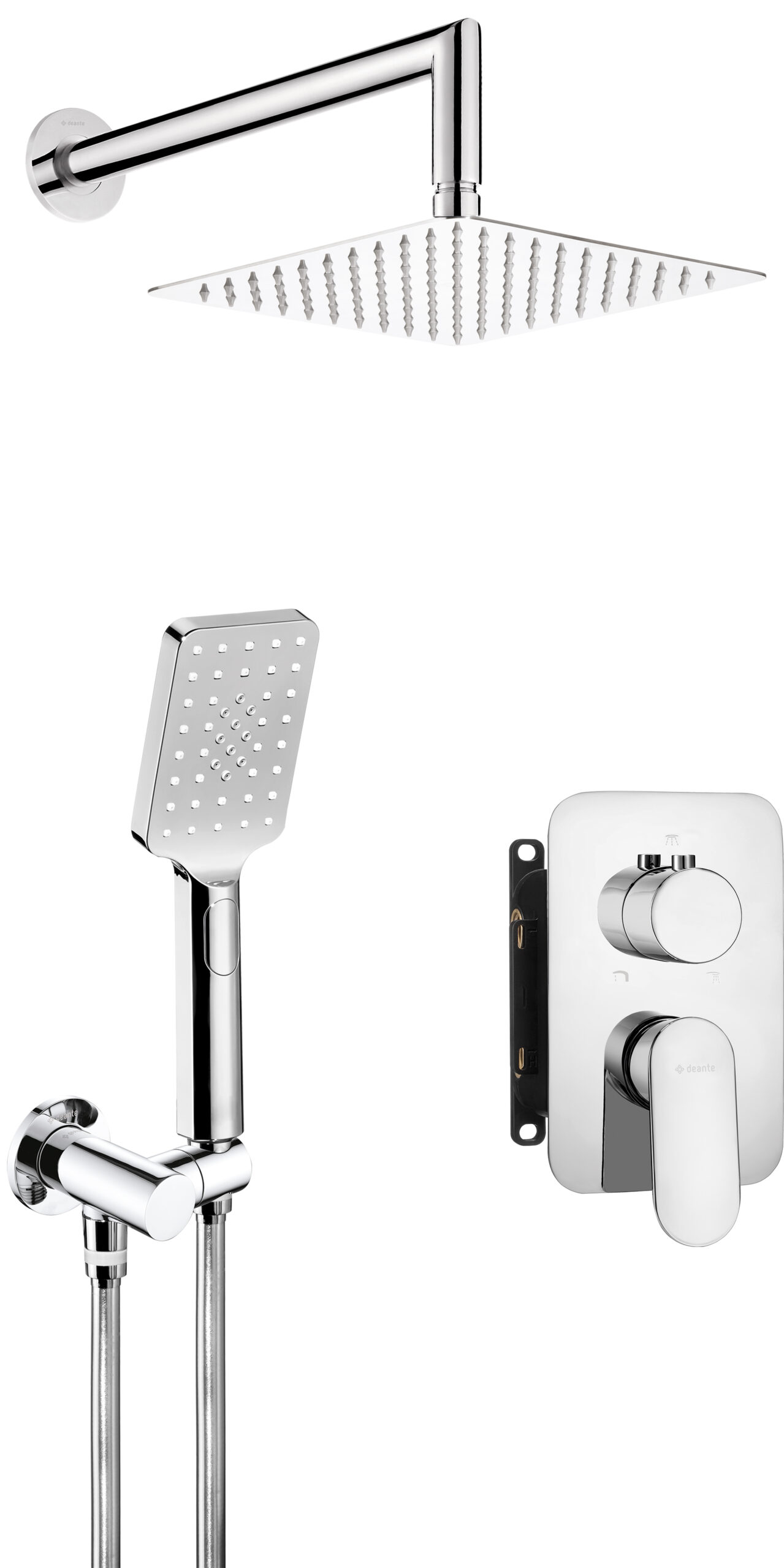 Zestaw prysznicowy składa się z BOXa, deszczowni i słuchawki wraz z uchwytem i wężem. Montaż podtynkowy charakteryzuje się nowoczesnym designem i wyjątkową estetyką. Zarówno słuchawka, jak i deszczownia posiadają system anti-calc, dzięki czemu są łatwe do utrzymania w czystości. Kupując zestaw, masz pewność, że wszystkie elementy będą idealnie do siebie pasowały.
