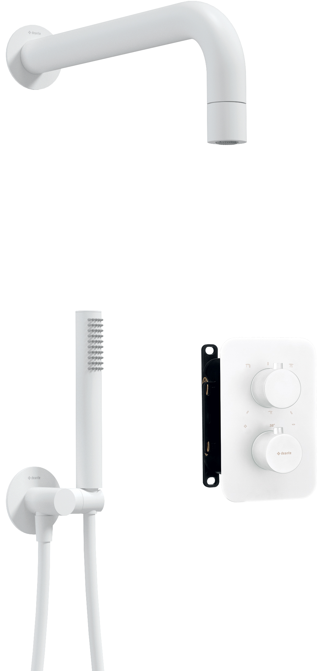 Komplet natryskowy to idealne połączenie nowoczesnego designu, funkcjonalności i komfortu użytkowania. Dzięki systemowi termostatycznemu gwarantuje precyzyjną kontrolę temperatury wody, eliminując ryzyko nagłych zmian i zapewniając bezpieczeństwo podczas kąpieli. Podtynkowy montaż sprawia, że cała instalacja jest estetycznie ukryta, co nadaje wnętrzu minimalistyczny i uporządkowany wygląd. Zestaw składa się z małej główki prysznicowej oraz ergonomicznej słuchawki z wężem i przyłączem kątowym. Główka prysznicowa zapewnia optymalny strumień wody w kształcie stożka. Całość wykończona jest w matowej bieli.