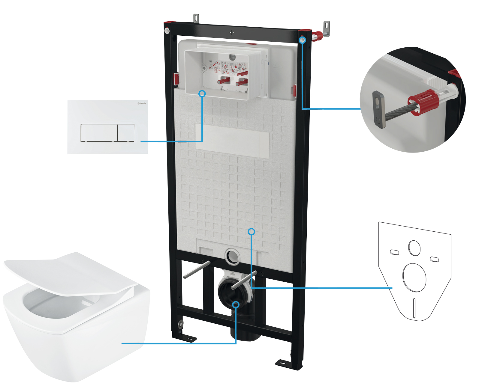 Prezentowany tu zestaw do WC do podtynkowego montażu 6w1, w skład którego wchodzi wisząca, bezkołnierzowa miska wc z geometrycznej kolekcji Blur, deska wolnoopadająca Slim, stelaż podtynkowy, podkładka akustyczna, wsporniki mocujące i przycisk spłukujący Slim w białym kolorze, to produkt idealny zarówno do małych, jak i dużych łazienek urządzonych w minimalistycznym stylu. Miska została zaprojektowana z myślą o maksymalnym komforcie użytkowania przy minimalnym wysiłku. W odniesieniu do prezentowanej tu wiszącej miski WC, oznacza to gładkie linie oraz brak standardowego kołnierza bez trudnych do utrzymania w czystości kątów, rantów i zakamarków. Design miski nie tylko skraca czas czyszczenia toalety i ilość wykorzystywanych do tego detergentów, ale także sprawia, że do spłukania muszli potrzeba mniej wody, co zmniejsza jej zużycie i jest zgodne z filozofią Proeco marki Deante. Również stelaż charakteryzuje się ekologicznym rozwiązaniem i możliwością podwójnego spłukiwania – małego (3l) i dużego (6l), co także ogranicza ilość zużywanej wody. Ponadto zarówno napełnianie 9l zbiornika, jak i samo spłukiwanie jest stosunkowo ciche, co jest szczególnie ważne przy montażu w mieszkaniach. Ukryte mocowania miski, chromowane zawiasy wolnoopadającej deski, podkładka akustyczna, która wygłusza i niweluje nierówności pomiędzy płytką i miską WC i minimalistyczny design eleganckiego przycisku, to dodatkowe zalety tego podtynkowego zestawu do WC, przeznaczonego do zabudowy lekkiej lub przed ścianą nośną.