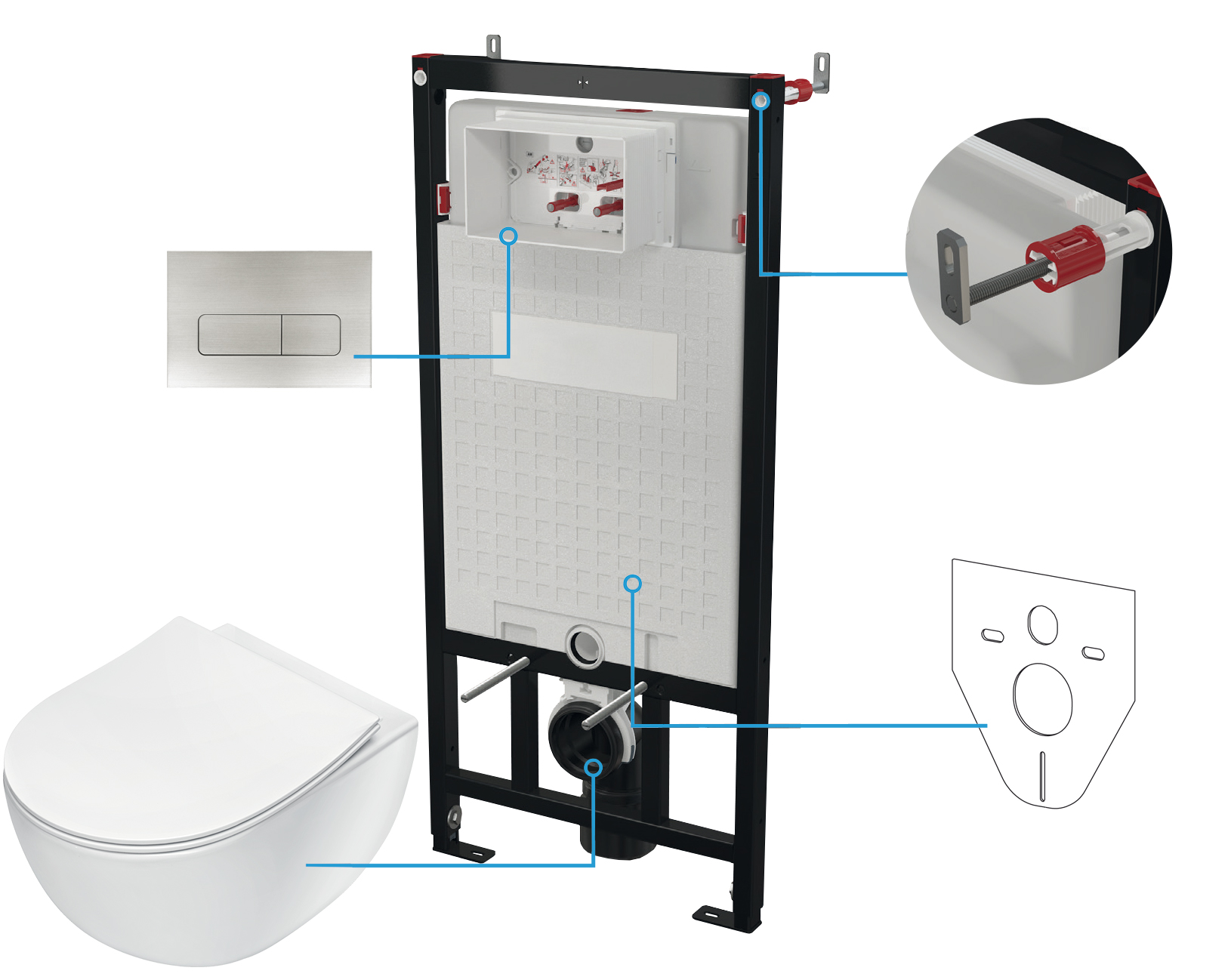 Zestaw WC do podtynkowego montażu składa się z miski WC Peonia wraz z deską, ze stelaża podtynkowego do misek wiszących oraz przycisku spłukującego. Bezkołnierzowa miska Peonia ma zaokrąglone kształty, pozbawiona jest rantów i zakamarków, co znacznie ułatwia utrzymanie jej w czystości. Muszla jest w komplecie z wolnoopadającą deską. Stelaż posiada możliwość cichego, podwójnego spłukiwania – małego (3l) oraz dużego (6l). Przycisk ma płaską konstrukcję, idealnie przylega do ściany i wykończony jest w kolorze stali szczotkowanej, która doskonale harmonizuje z armaturą i dodatkami w tym samym wykończeniu.