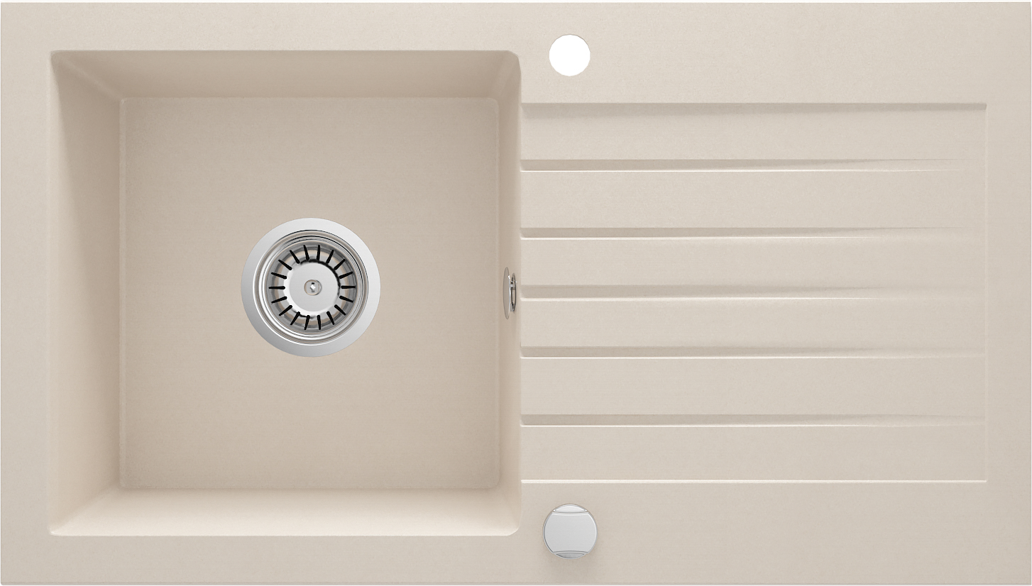 Beżowy, granitowy zlewozmywak 1-komorowy Zorba z jedną przestronną, prostopadłościenną komorą i dużym, wygodnym ociekaczem to produkt, który doskonale prezentować się będzie w klasycznych lub rustykalnych aranżacjach kuchni. Delikatny, jasny odcień akcesorium będzie efektownie kontrastować z drewnianym blatem, bądź idealnie wtopi się w przestrzeń roboczą kuchni, zaaranżowaną za pomocą jasnego kamienia lub kompozytu. Prezentowany tu zlewozmywak z ociekaczem wykonany został z granitu i charakteryzuje się wszystkimi zaletami typowymi dla tego niezwykle twardego i odpornego na użytkowanie materiału. Należy do nich odporność na przebarwienia, zarysowania, szok termiczny, temperaturę 250 stopni jak i uderzenia. Ponadto zlewy z kolekcji posiadają właściwości hydrofobowe, co oznacza, że ich powierzchnia nie tylko nie przepuszcza cząsteczek wody, ale także je odpycha, dzięki czemu są dużo łatwiejsze do utrzymania w czystości. Wszystkie te zalety, jak również współczesny, ascetyczny design, eleganckie kolory i uniwersalny charakter sprawiły, że kolekcja zlewozmywaków Zorba wyróżniona została tytułem finalisty konkursu Dobry Wzór 2014 r.