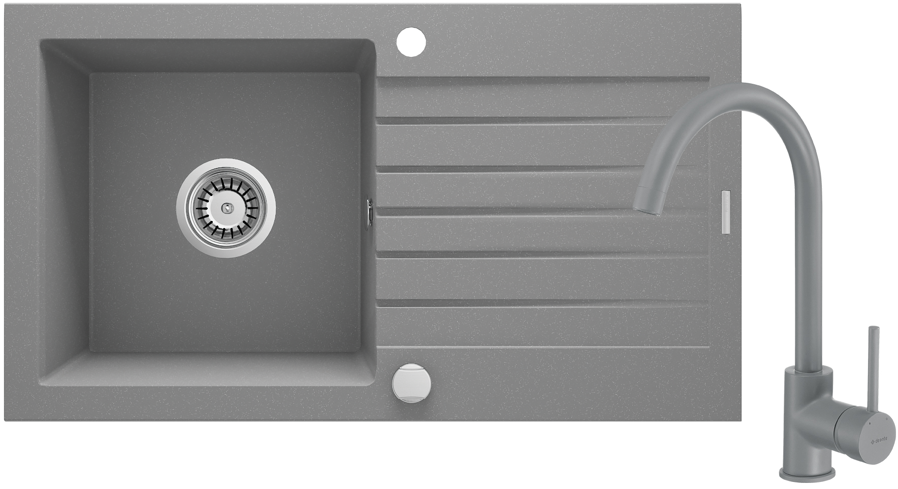 Granitowy zlewozmywak 1-komorowy Zorba z jedną przestronną, prostopadłościenną komorą z dużym, wygodnym ociekaczem, to produkt, który doskonale prezentować się będzie w minimalistycznych lub skandynawskich aranżacjach kuchni. Szary odcień będzie efektownie kontrastować z czarnym, kamiennym lub kompozytowym blatem, a metaliczny połysk, pochodzący od drobin aluminium wprowadza element ekstrawagancji. W komplecie znalazła się także efektowna, stojąca bateria zlewozmywakowa z podwyższonym korpusem i wylewką w kształcie litery „U” w pasującym, grafitowym kolorze, która podkreśli minimalistyczny charakter stylizacji. Prezentowany tu zlewozmywak wykonany został z granitu i charakteryzuje się wszystkimi zaletami typowymi dla tego niezwykle twardego i odpornego na użytkowanie materiału. Należy do nich odporność na przebarwienia, zarysowania, szok termiczny, temperaturę 250 stopni jak i uderzenia. Ponadto zlewy z kolekcji posiadają właściwości hydrofobowe, co oznacza, że ich powierzchnia nie tylko nie przepuszcza cząsteczek wody, ale także je odpycha, dzięki czemu są dużo łatwiejsze do utrzymania w czystości. Wszystkie te zalety, jak również współczesny, ascetyczny design, eleganckie kolory i uniwersalny charakter sprawiły, że kolekcja zlewozmywaków Zorba wyróżniona została tytułem finalisty konkursu Dobry Wzór 2014 r.