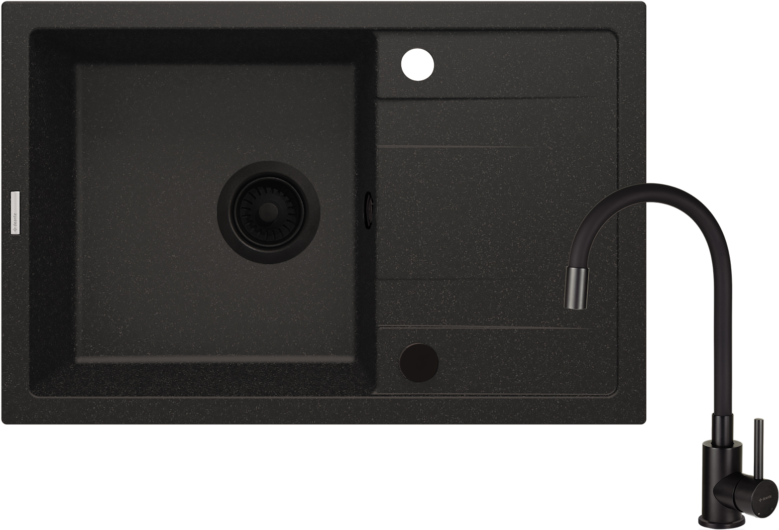 Zestaw idealnie dopasowany. Czarny, jednokomorowy zlewozmywak granitowy z praktycznym ociekaczem zachwyca nie tylko wyglądem, ale także wyjątkową trwałością. Granit, zgodny z normą PN-EN 13310, cechuje się odpornością na uderzenia, szok termiczny i przebarwienia. Właściwości hydrofobowe zapobiegają osadzaniu się wody, a dodatek jonów srebra nadaje zlewozmywakowi właściwości antyseptyczne. W zestawie znajduje się również syfon Space-saver, który oszczędza miejsce w szafce i ułatwia segregację śmieci. Czarna bateria z giętą wylewką dopełnia całości, gwarantując wygodę i estetykę.